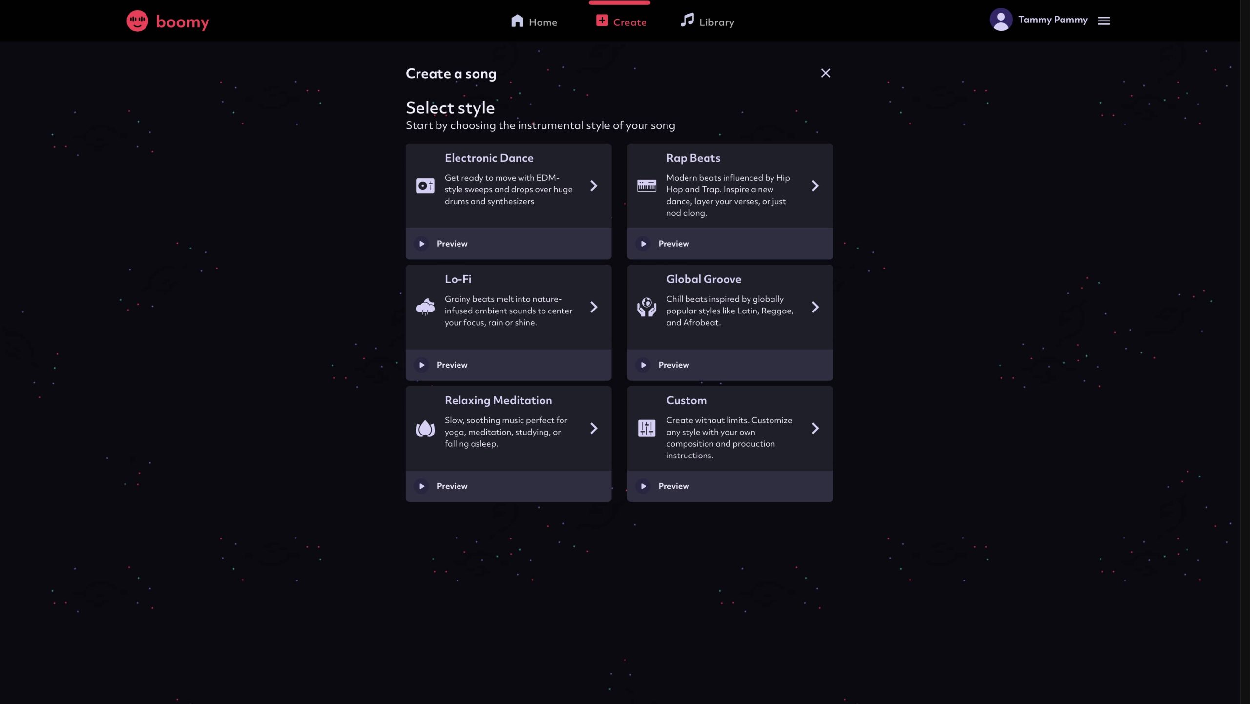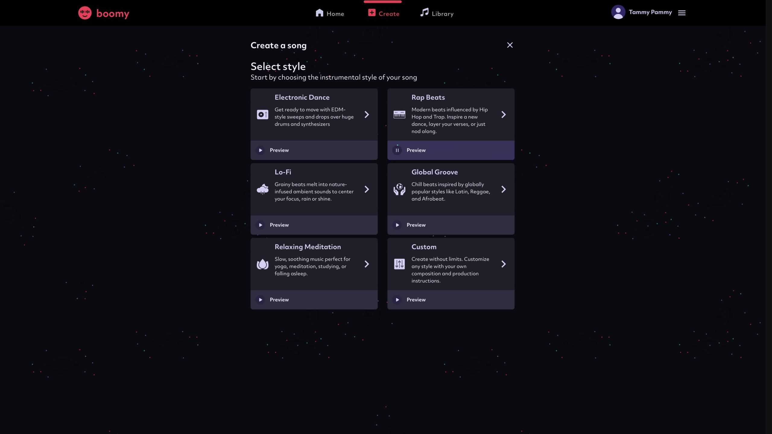 ให้เราเลือกแนวเพลงที่ชอบได้เลย จะมีให้เลือกมากมายไม่ว่าจะเป็น Electronic, Dance, Rap, Beats, Lo-Fi, Global Groove, Relaxing Meditation, Custom