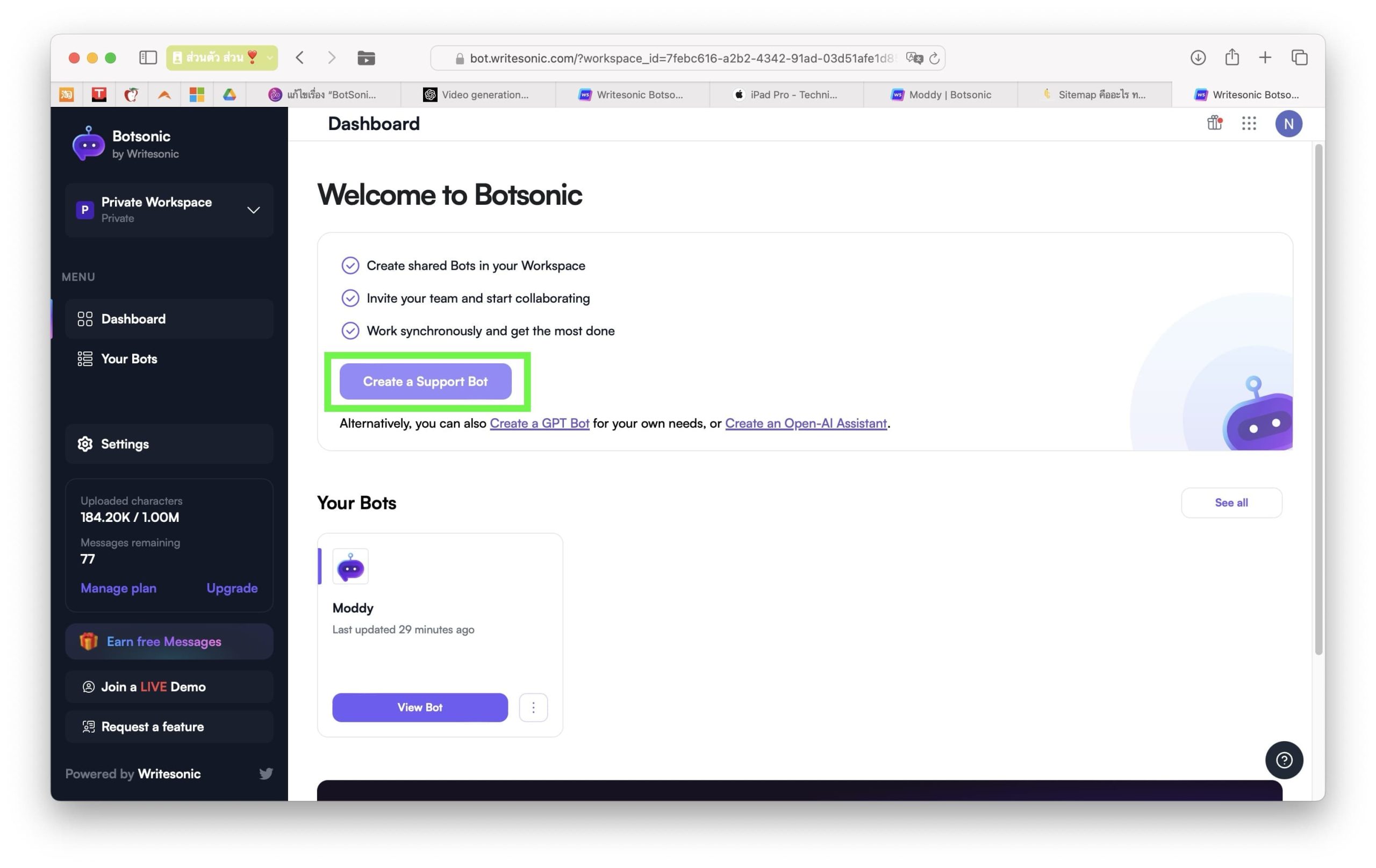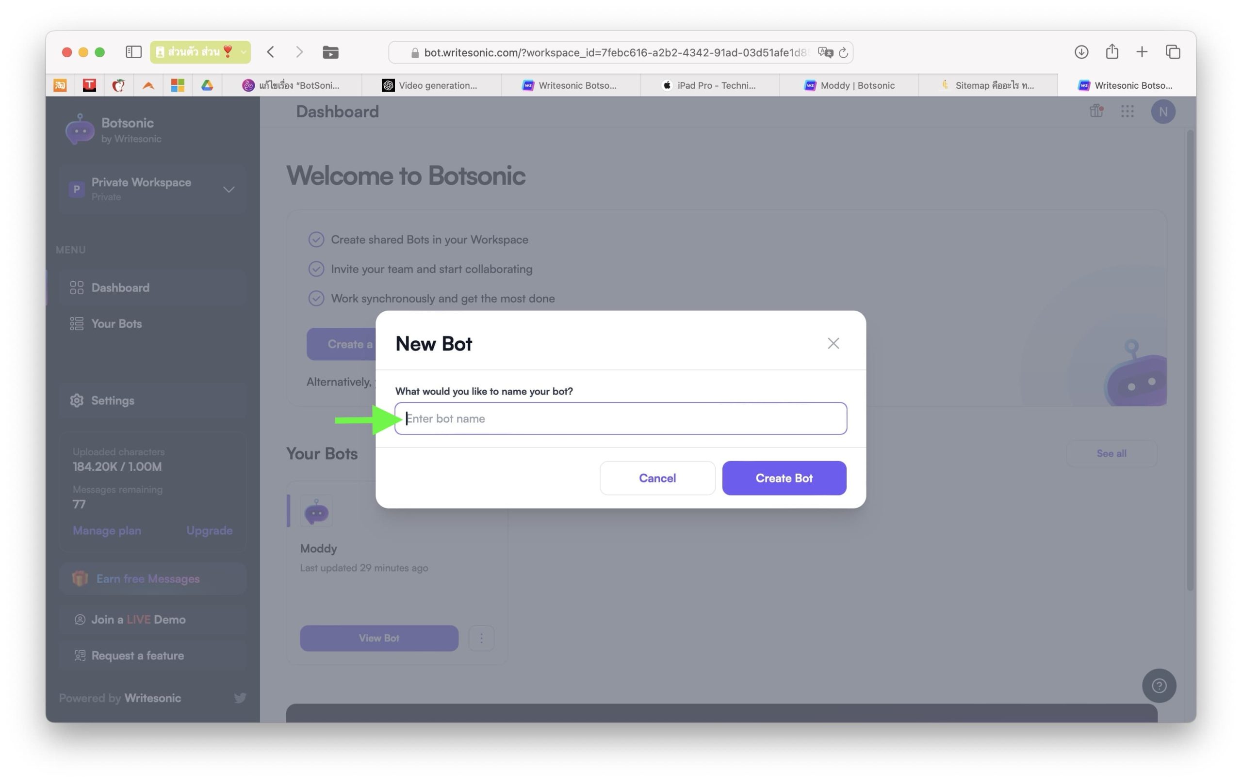 เข้าไปที่เว็บไซต์ https://bot.writesonic.com/?workspace