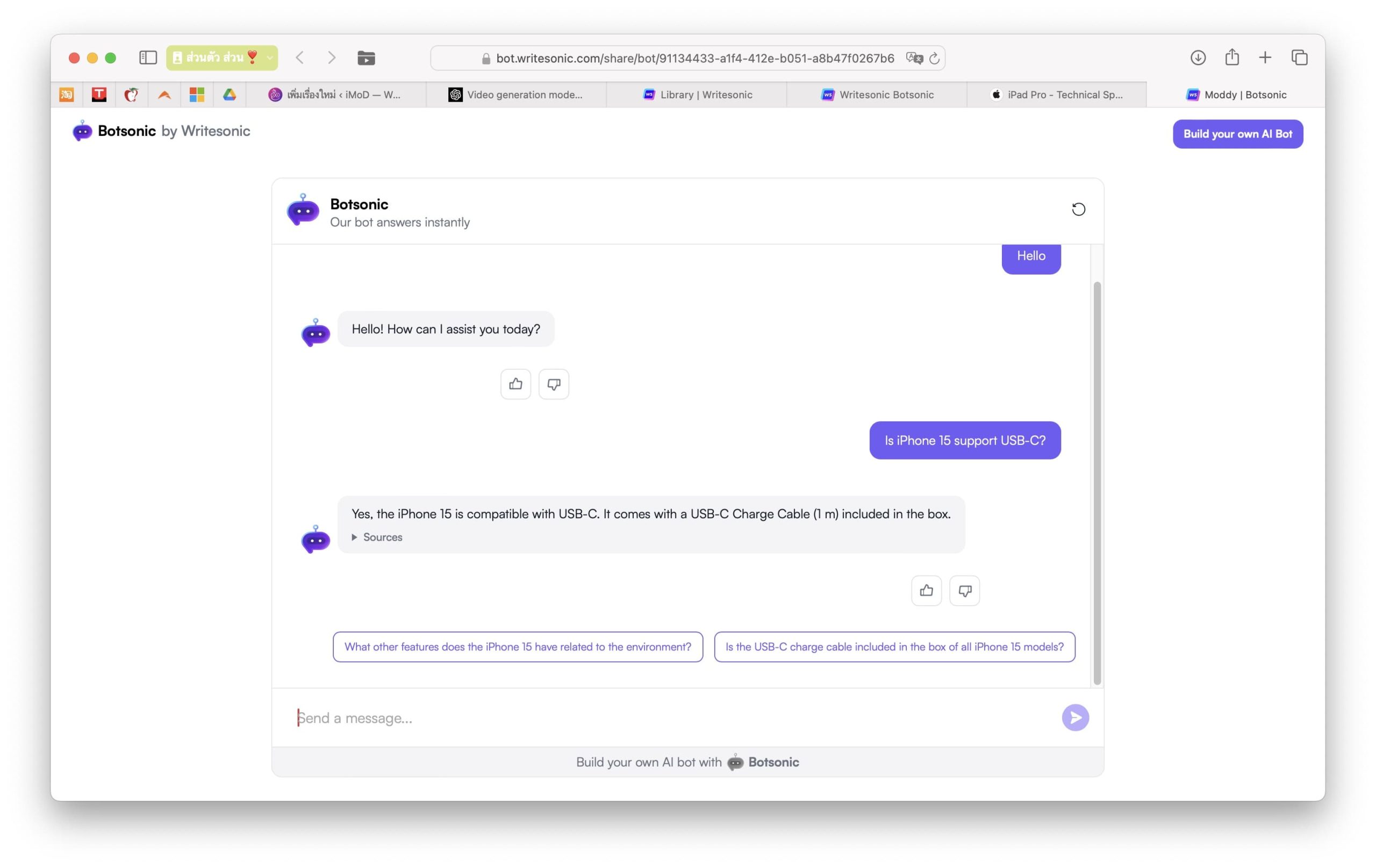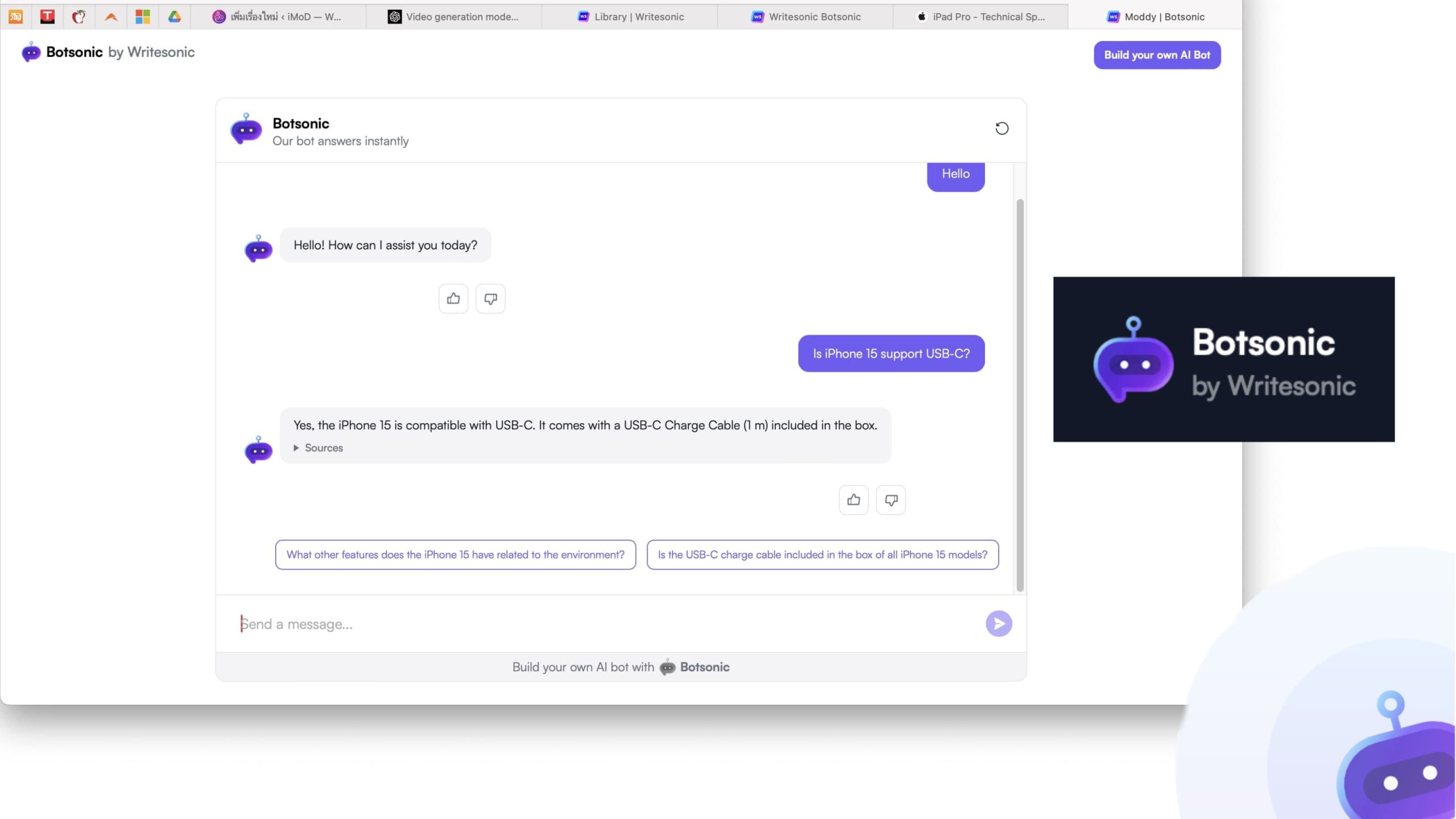 BotSonic เป็น AI สร้างแชทบอทของผู้พัฒนาที่ชื่อว่า WriteSonic โดยตัว BotSonic นี้เป็นแชทบอท (Chat Bot) ที่เราสามารถสร้างขึ้นมา ใส่ข้อมูลลงไปเพื่อทำการเทรนให้ตัวบอทมีความรู้ เมื่อเทรนเสร็จเราก็สามารถถามในสิ่งที่ต้องการได้