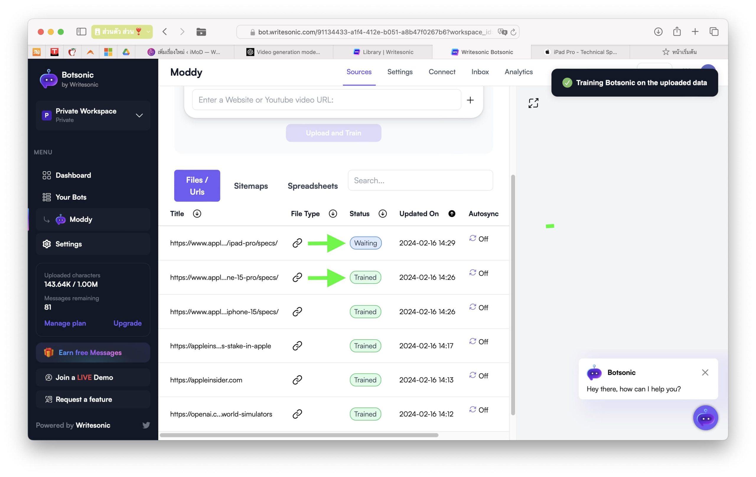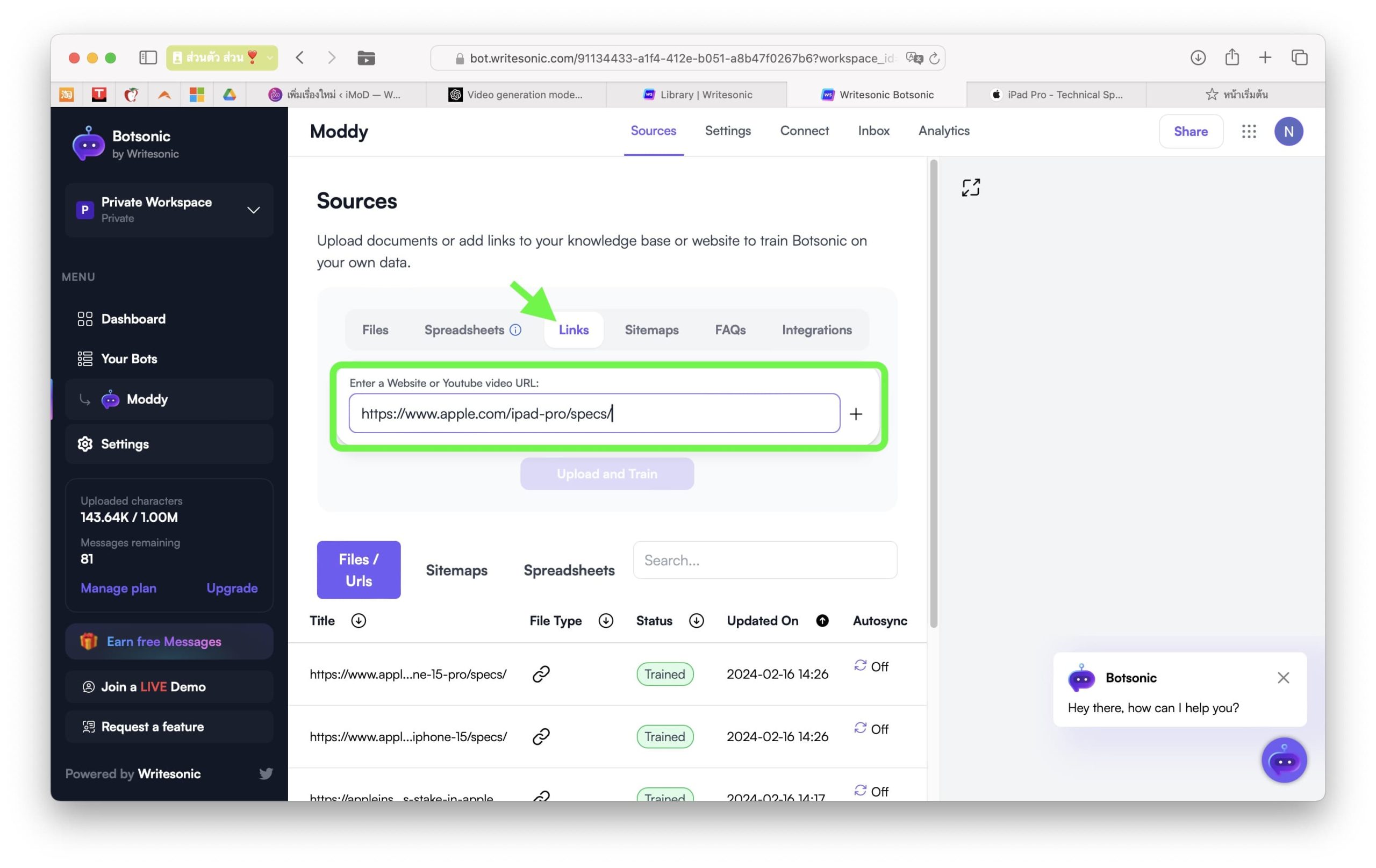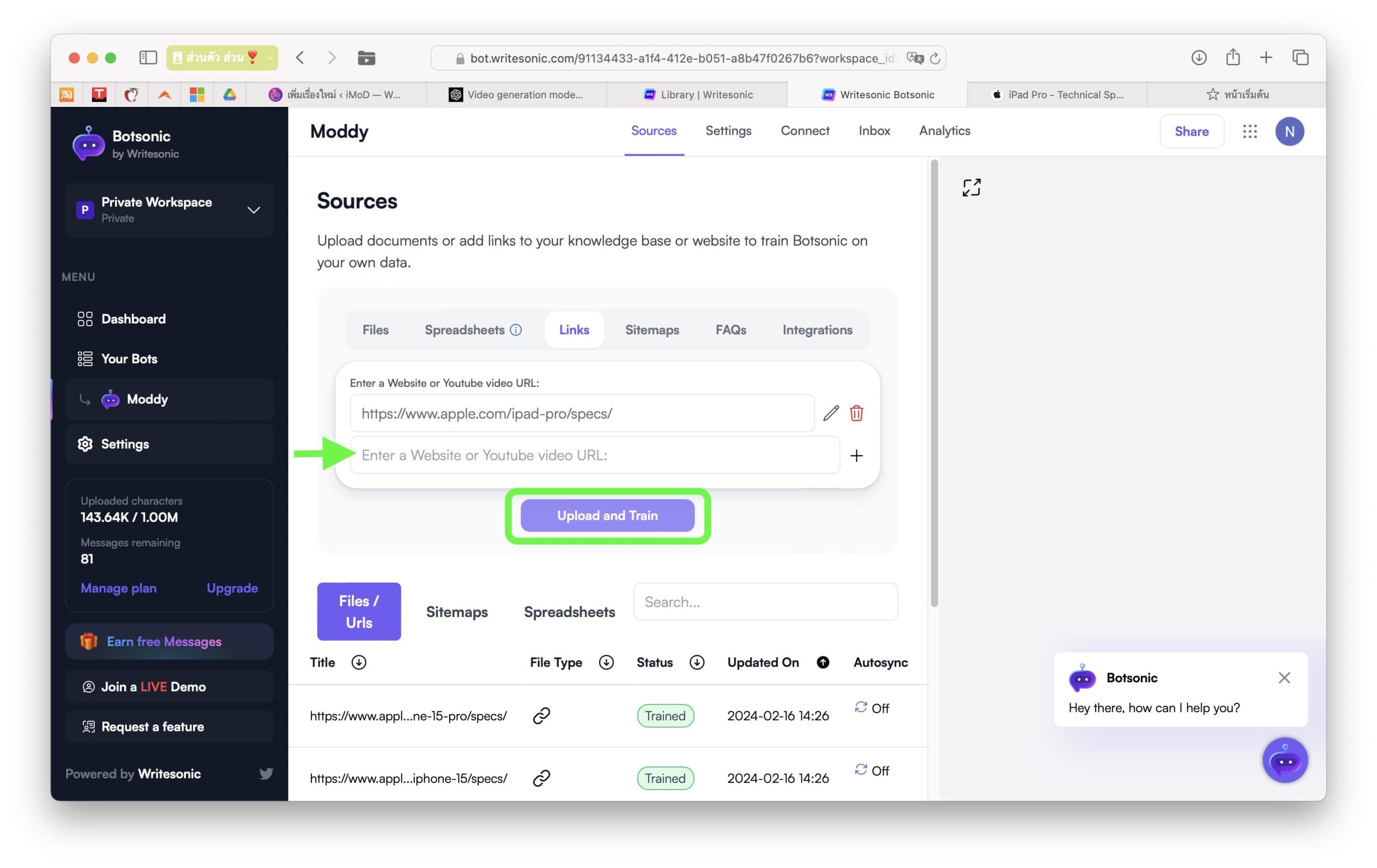 กดปุ่ม “Upload and Train” เพื่อเริ่มเทรนบอทของเราด้วยข้อมูลจากลิงก์อันนี้ หากอยากให้บอทเรียนรู้พร้อมกันหลาย ๆ ลิงก์ก็ให้ใส่ลิงก์เพิ่มในช่องด้านล่างได้เลย