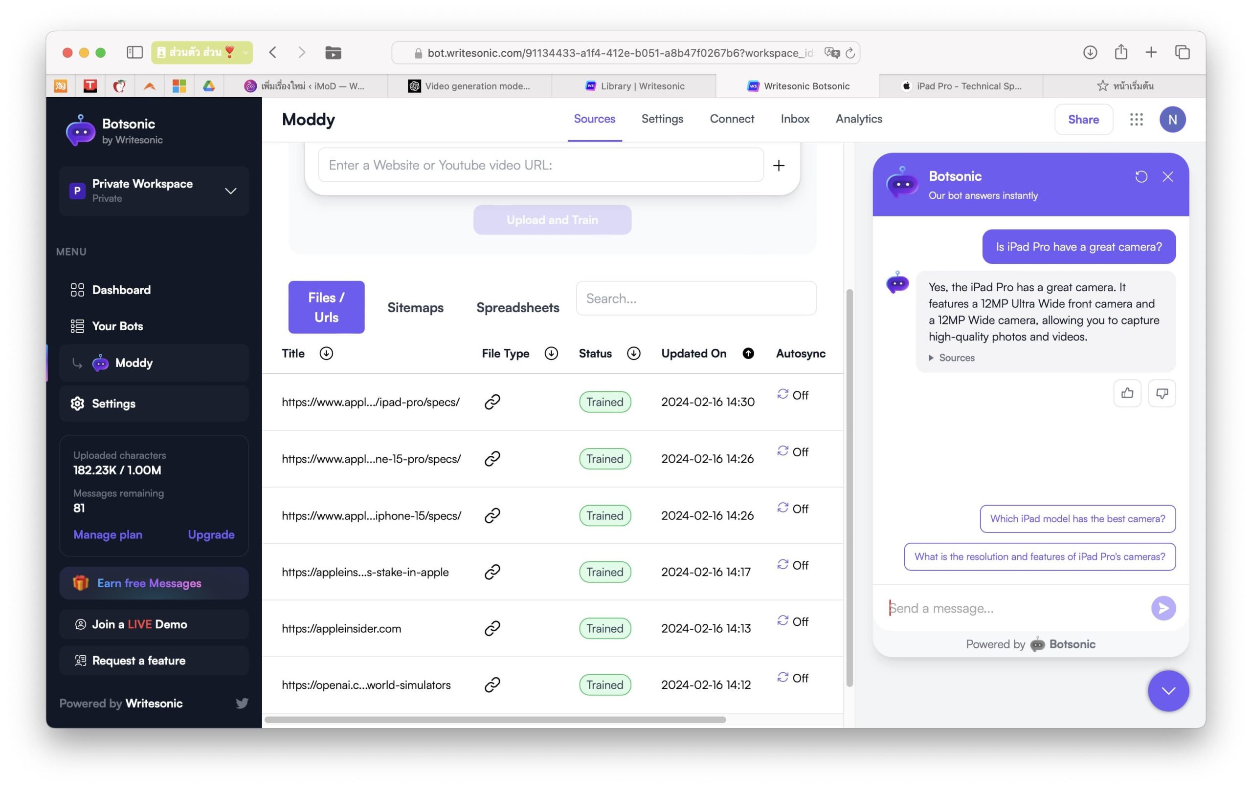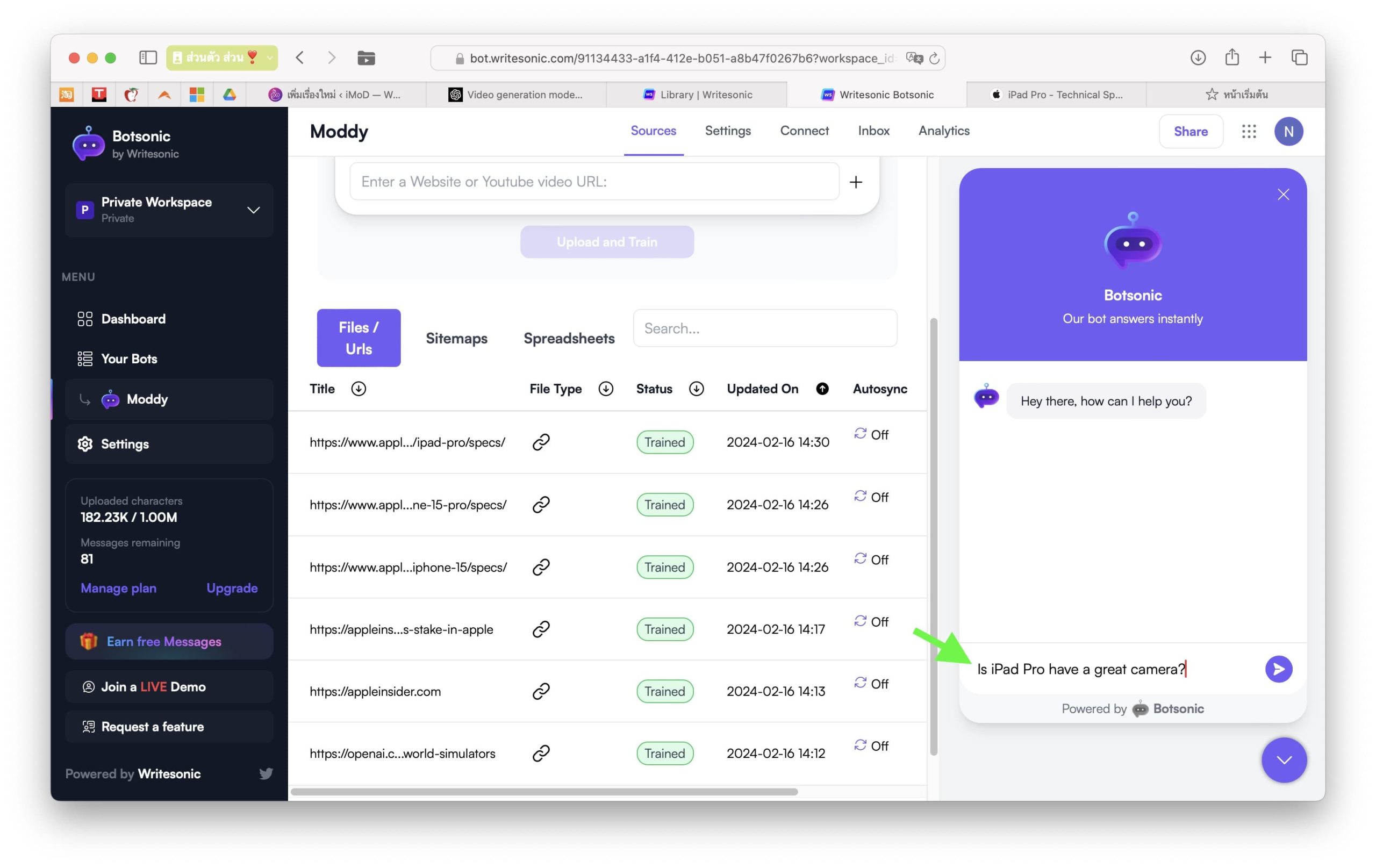 หลายคนอาจใช้บอทตัวนี้ในการเก็บ Data จำนวนมาก ซึ่งในเวอร์ชันฟรี BotSonic สามารถอ่านตัวหนังสือและข้อมูลได้สูงสุด 1 ล้านตัวอักษร หากเราเทรนบอทไปเรื่อย ๆ ตัวบอทก็จะมีความสามารถและตอบคำถามต่าง ๆ ได้มากขึ้น เพื่อให้เห็นภาพ เรามาลองใช้งานกันเลย