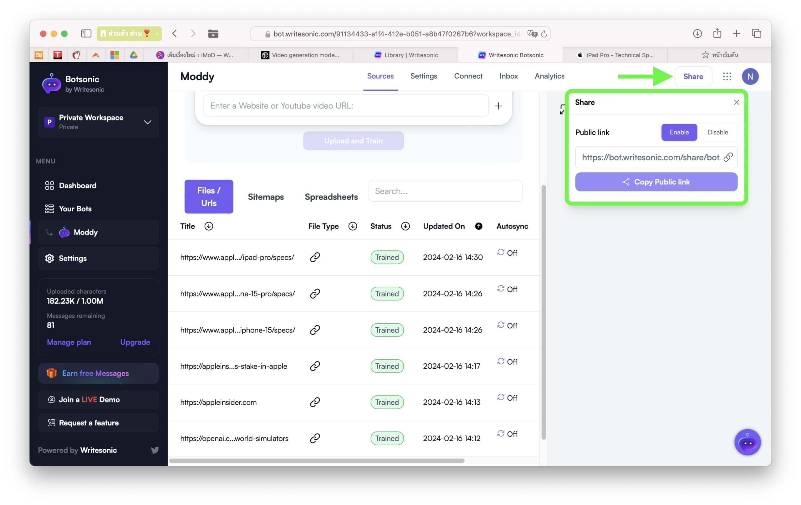 เราสามารถแชร์ลิงก์ของเจ้าแชทบอทตัวนี้ไปให้คนอื่นใช้งานได้ อาจจะแชร์ให้ลูกค้า หรือเพื่อนร่วมองค์กร ใช้ตอบคำถามที่หลาย ๆ คนในองค์กรสงสัย