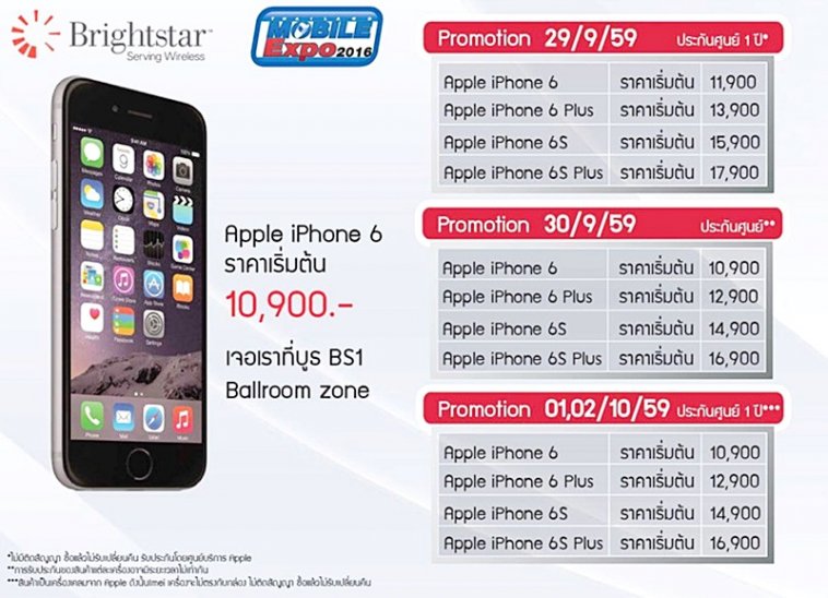 ในวันพฤหัสจะเป็นการจำหน่ายเครื่องเปล่าไม่ติดสัญญา ซื้อแล้วไม่รับคืน มีประกันศูนย์ Apple อยู่ที่ 1 ปีเต็ม iPhone 6 ราคาเริ่มต้นที่ 11,900 บาท และ iPhone 6s ราคาเริ่มต้นที่ 15,900 บาท