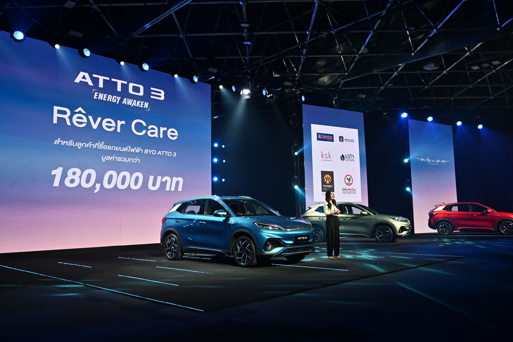 (กรุงเทพมหานคร) 10 ตุลาคม 2565 – บริษัท Rêver Automotive จำกัด (เรเว่ ออโตโมทีฟ) ในฐานะผู้จัดจำหน่ายและให้บริการหลังการขายสำหรับกลุ่มรถยนต์พลังงานใหม่ในประเทศไทยอย่างเป็นทางการ (Thailand Authorized Distributor) จัดแถลงข่าวเปิดตัว BYD ATTO 3 ภายใต้แนวคิด “ENERGY AWAKEN ปลุกพลังใหม่ ปลุกชีวิตที่ดีกว่า” พร้อมประกาศราคา 1,199,900 บาท (หลังรับเงินสนับสนุนจากภาครัฐ) เพื่อให้คนไทยได้สัมผัส Premium SUV เทคโนโลยีขั้นสุดของยานยนต์พลังงานไฟฟ้าที่แท้จริง ซึ่งเปี่ยมไปด้วยสมรรถนะ เทคโนโลยี และนวัตกรรม ตลอดจนสุดดีไซน์โฉบเฉี่ยว พร้อม Rêver Care ดูแลรถทุกคันแบบจัดเต็มมูลค่า 180,000 บาท การันตีเงินอุดหนุนจากภาครัฐสูงสุดที่ 150,000 บาท โดยมีโชว์รูมอีกกว่า 32 แห่งทั่วประเทศร่วมสร้างความเชื่อมั่นขับเคลื่อนประเทศสู่ NEV Nation