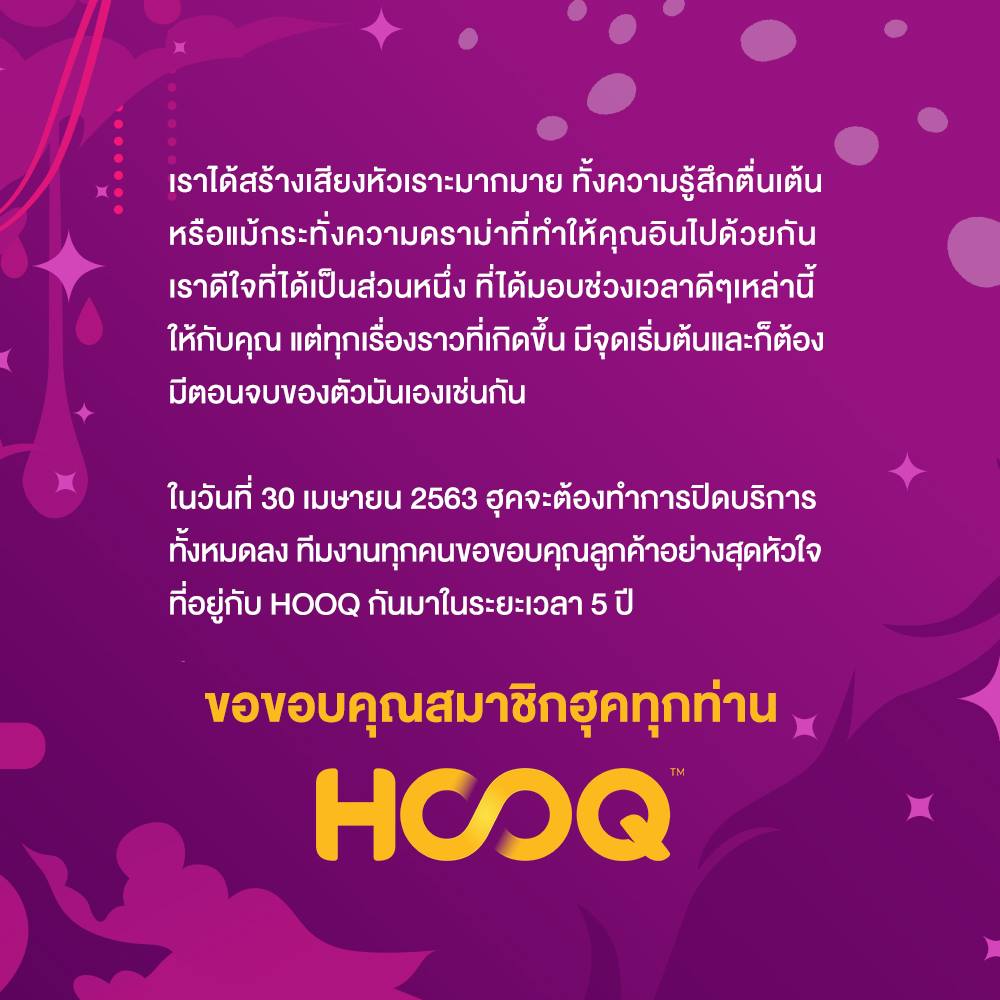 HOOQ ได้ประกาศผ่าน Facebook ว่าจะปิดให้บริการในวันที่ 30 เมษายน 2563 และขอบคุณลูกค้าที่อยู่กับฮุคเสมอมาตลอด 5 ปี โดยสำหรับการปิดให้บริการนี้จะเป็นการยกเลิกตัดเงินโดยอัตโนมัติ เท่ากับว่าในไทยตอนนี้ก็มีจะเหลือผู้เล่นรายใหญ่เพียงแค่ Netflix, HBO GO, Apple TV, iFlix, VIU เท่านั้น