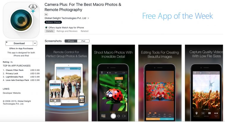 Free App of the Week จาก Apple รอบนี้เป็นแอปถ่ายภาพที่มีชื่อว่า Camera Plus (คนละตัวกับ Camera+ นะครับ) แอปนี้โดดเด่นในแง่การถ่ายภาพมาโครและมี AirSnap รองรับรีโมทชัตเตอร์ด้วยอุปกรณ์ iOS อื่นๆ
