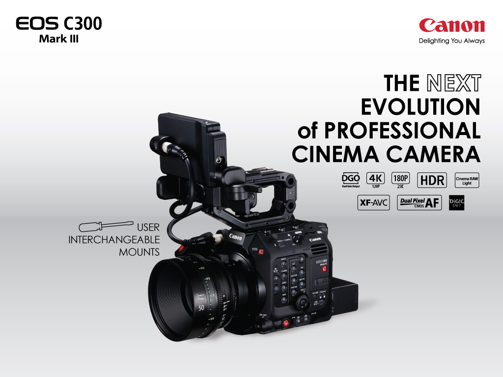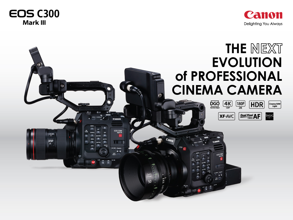 เปิดตัวกล้องถ่ายภาพยนตร์ EOS C300 Mark III โดยมีจุดเด่นอยู่ตรงที่ช่วงไดนามิกสูง และการเลือกใช้เซ็นเซอร์ Dual Gain Output (DGO) ที่พัฒนาขึ้นใหม่และรองรับการบันทึกอัตราเฟรมสูง สามารถถ่ายได้ที่ความละเอียดระดับ 4K/ 120p