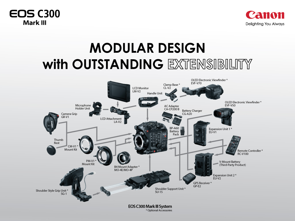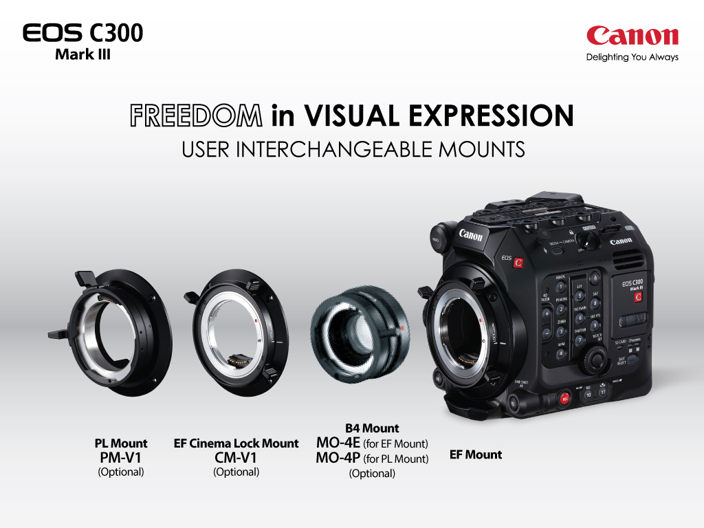 ด้วยการออกแบบกล้อง EOS C300 Mark III ให้สามารถแยกส่วนได้เช่นเดียวกับ EOS C500 Mark II ผู้ใช้จึงสามารถปรับแต่งกล้องให้เหมาะกับสภาพแวดล้อมในการทำงานได้ตามต้องการ รวมถึงใช้งานร่วมกับอุปกรณ์เสริมต่าง ๆ ซึ่งมีให้เลือกหลากหลาย (แยกจำหน่าย) หรือจะติดเมาท์เพิ่มเติม (แยกจำหน่าย) เพื่อให้ผู้ใช้สามารถเปลี่ยนเมาท์ของตัวกล้องจากเมาท์ EF เป็นเมาท์สำหรับเลนส์ PL หรือ EF Cinema Lock ได้ เพื่อใช้งานร่วมกับกับเลนส์ประเภทต่างๆ ได้อีกด้วย