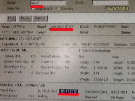 ข่าวสั้น ๆ แต่เป็นข่าวที่เราทุกคนให้ความสนใจกันในช่วงนี้ซึ่งก็คงหนีไม่พ้นข่าว iPad 3 มีรายงานว่าตอนนี้ร้านค้า Best Buy ที่เป็นร้านสินค้าอิเลคโทรนิคชื่อดังในอเมริกา มีการจัดส่งเคสของ iPad 3 เป็นจำนวนกว่าพันชิ้นเพื่อรองรับการเปิดตัว iPad ใหม่ที่จะเปิดตัวในวันที่ 7 มีนาคมนี้ โดยมีการออกคำสั่งอย่างเคร่งครัดถึงการห้ามวางจัดจำหน่ายก่อนจะมีการเปิดตัว iPad ครับ
