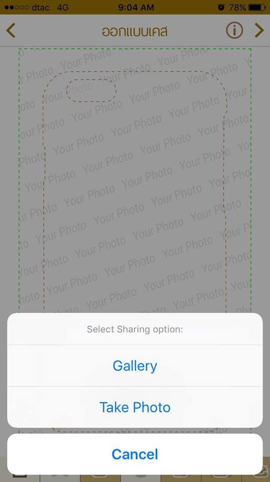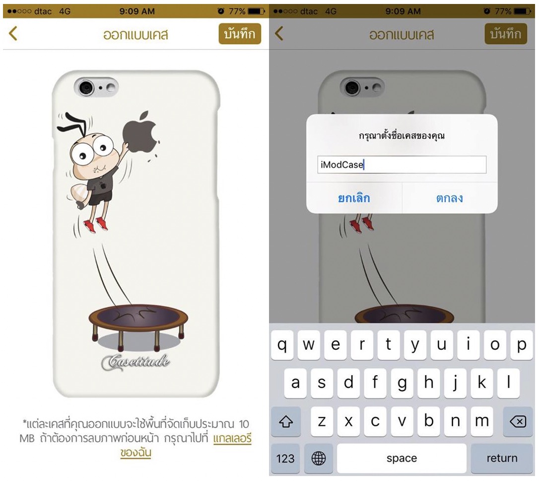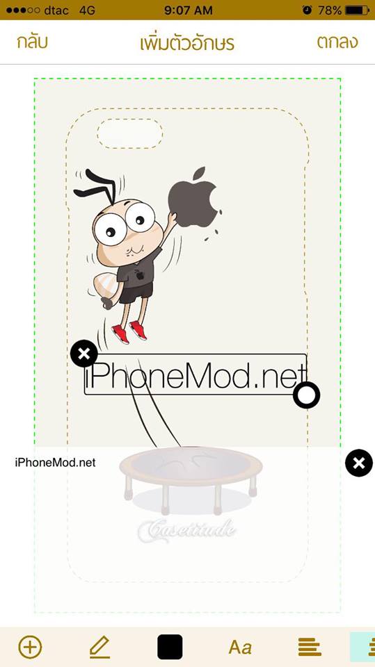 ขั้นตอนถัดมาจะเป็นการตกแต่งลวดลายเคสตามต้องการ โดยผู้ใช้สามารถเพิ่มข้อความที่ต้องการให้แสดงอยู่บนตัวเคสได้ โดยการแตะที่ไอคอนรูป Text