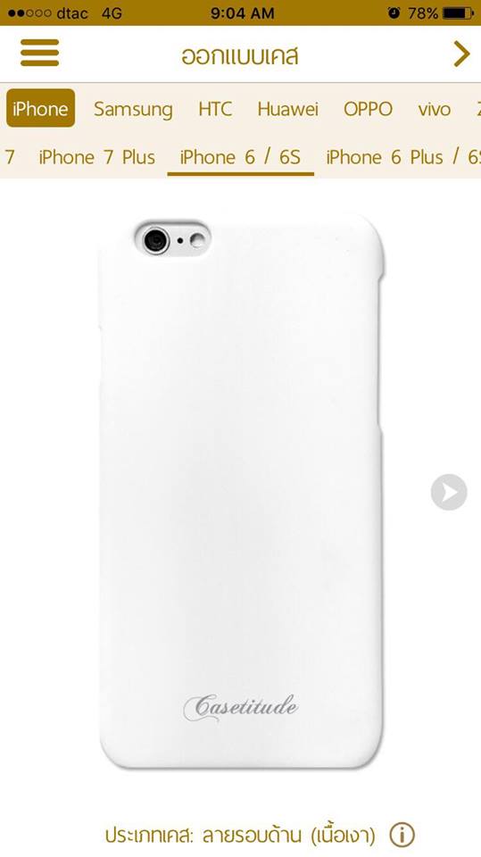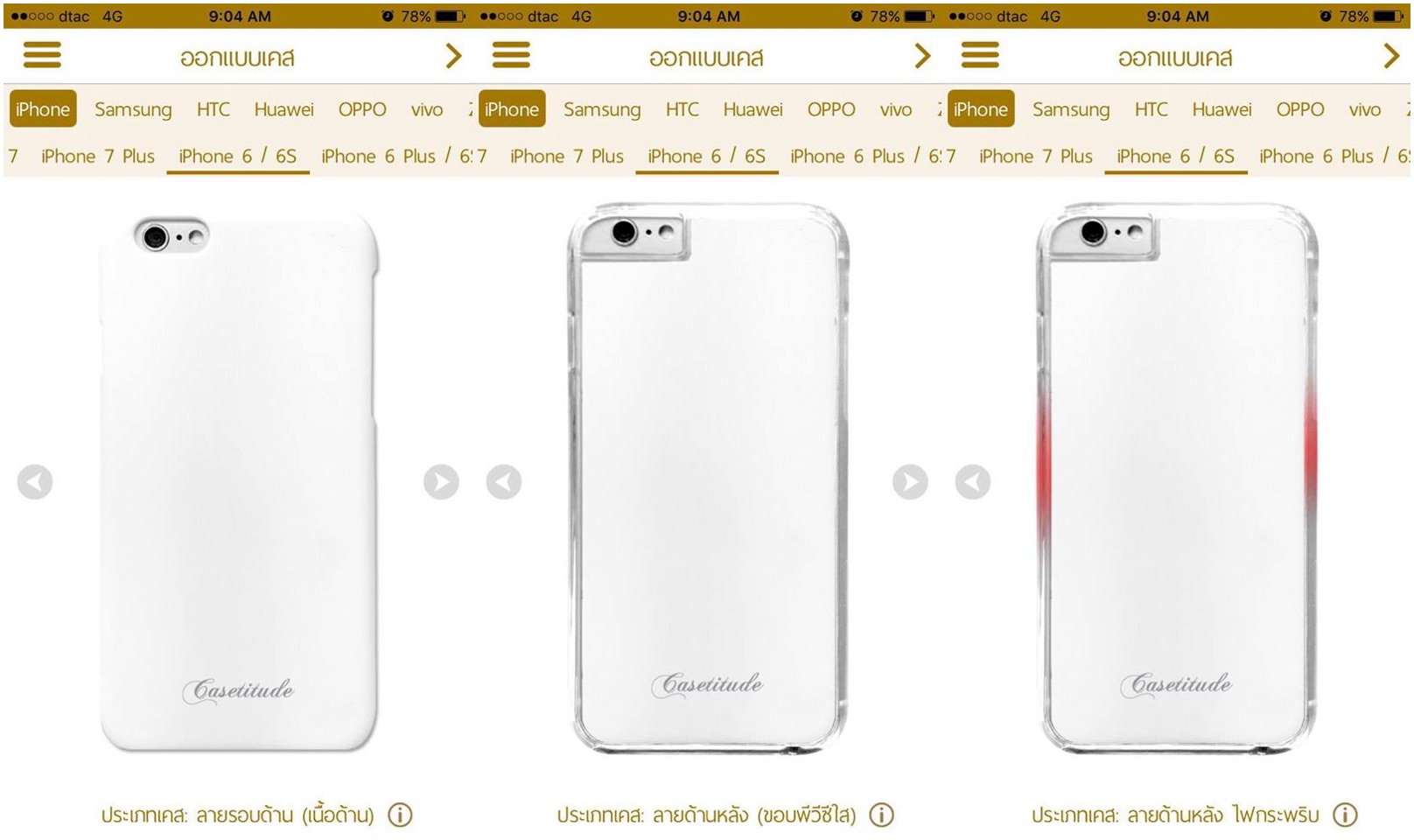ถัดลงมาก็จะเป็นการเลือกประเภทวัสดุของเคสมือถือ โดยใน Casetitude มีวัสดุเคสให้เลือกหลายแบบ ได้แก่ ลายรอบด้าน (เนื้อเงา), ลายรอบด้าน (เนื้อด้าน), ลายด้านหลัง (ขอบซิลิโคน), ลายด้านหลัง (ขอบพีวีซีใส) และลายด้านหลัง(ชุดใหญ่)ไฟกระพริบ 😀