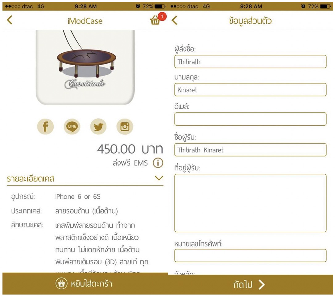 จากนั้นแตะรูปเคสที่เราต้องการสั่งซื้อแล้วแตะที่หยิบใส่ตะกร้า > ใส่รายละเอียดการสั่งซื้อ > ใส่รายละเอียดการชำระเงิน