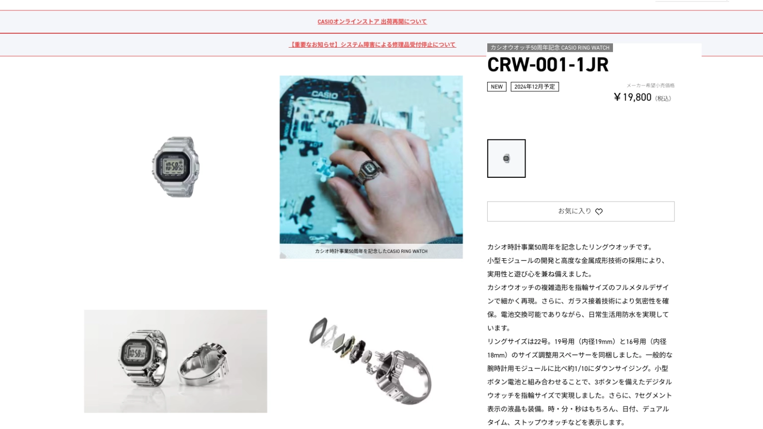 CRW-001-1JR มีกำหนดวางจำหน่ายช่วงเดือนธันวาคม 2024 ราคา 19,800 เยน หรือประมาณ 4,500 บาท โดยคาดว่าจะขายตัวแหวนแค่บนเว็บไซต์ของ Casio เท่านั้น และคาดจะเริ่มเปิดให้สั่งได้ตั้งแต่วันที่ 1 ธันวาคมนี้เป็นต้นไป