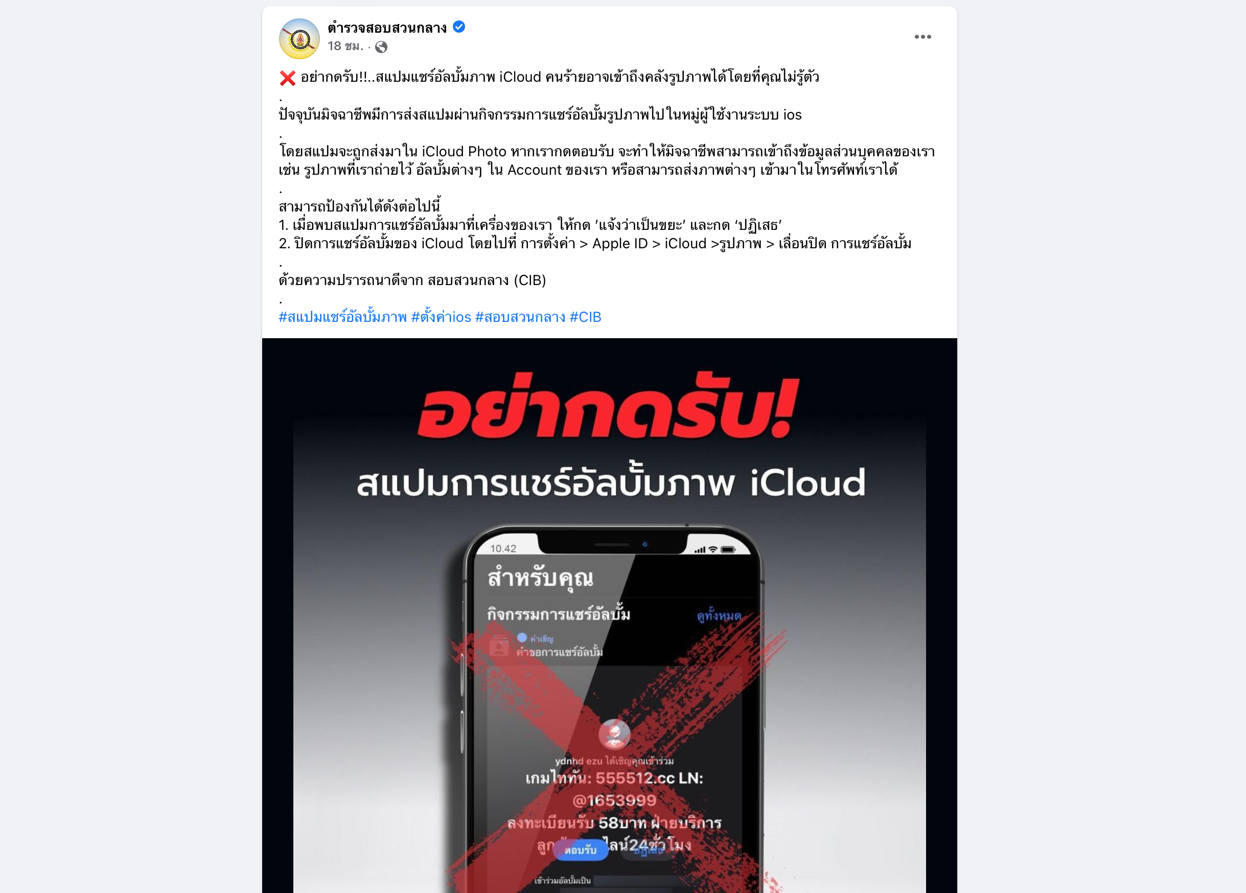 ตำรวจสอบสวนกลางออกมาเตือนผ่านทางหน้า Facebook ตำรวจสอบสวนกลาง เกี่ยวกับมิจฉาชีพออนไลน์ในรูปแบบ สแปมแชร์อัลบั้มภาพ iCloud ที่กลับมาระบาดอีกครั้งหลังจากเคยมีการหลอกลวงในรูปแบบนี้มาก่อนแล้ว