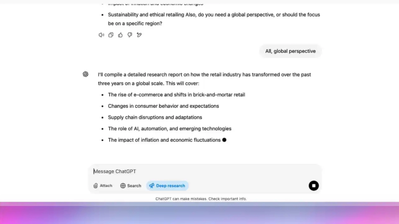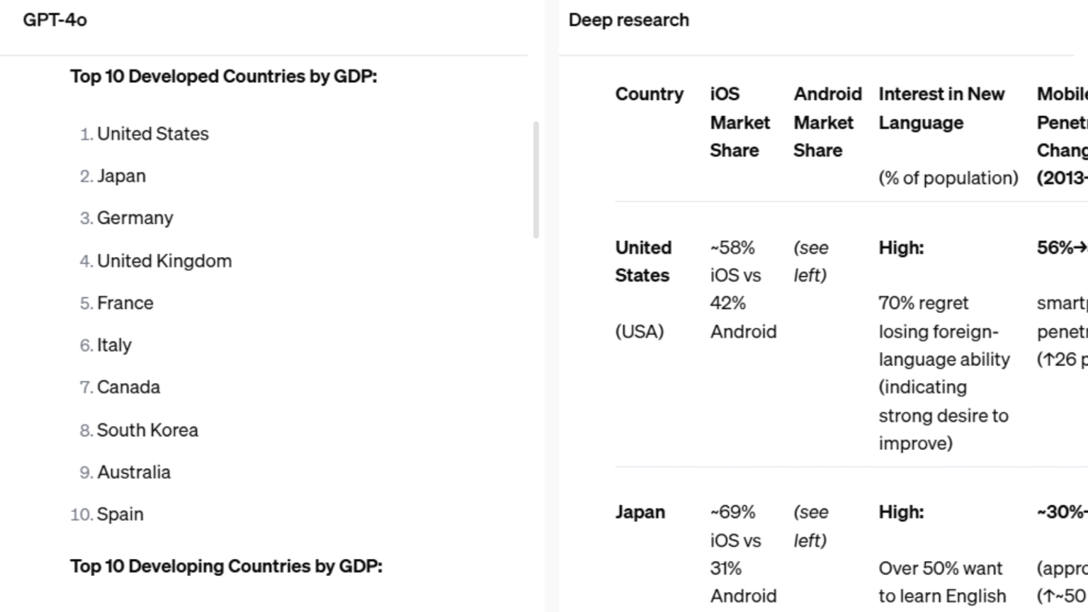 ในการเรียกใช้งานให้เลือกปุ่ม Deep Research ที่กล่องแชท คำถามจะถูกคิดและให้คำตอบด้วยวิธีการเชิงลึกมากขึ้น มีตัวอย่างเปรียบเทียบด้านล่างคือการวิเคราะห์โอกาสตลาดแอป iOS ในประเทศต่าง ๆ ซึ่งหากถาม GPT-4o จะได้คำตอบที่เร็วกว่า เป็นแบบกว้างและไม่ลงรายละเอียดนัก แต่ถ้าใช้ Deep Research คำตอบจะมาพร้อมตาราง ตัวเลข ระบุแหล่งอ้างอิง พร้อมข้อสรุป ซึ่งจะใช้เวลานานกว่าในการให้คำตอบ OpenAI บอกว่าอาจนานถึง 5-30 นาที
