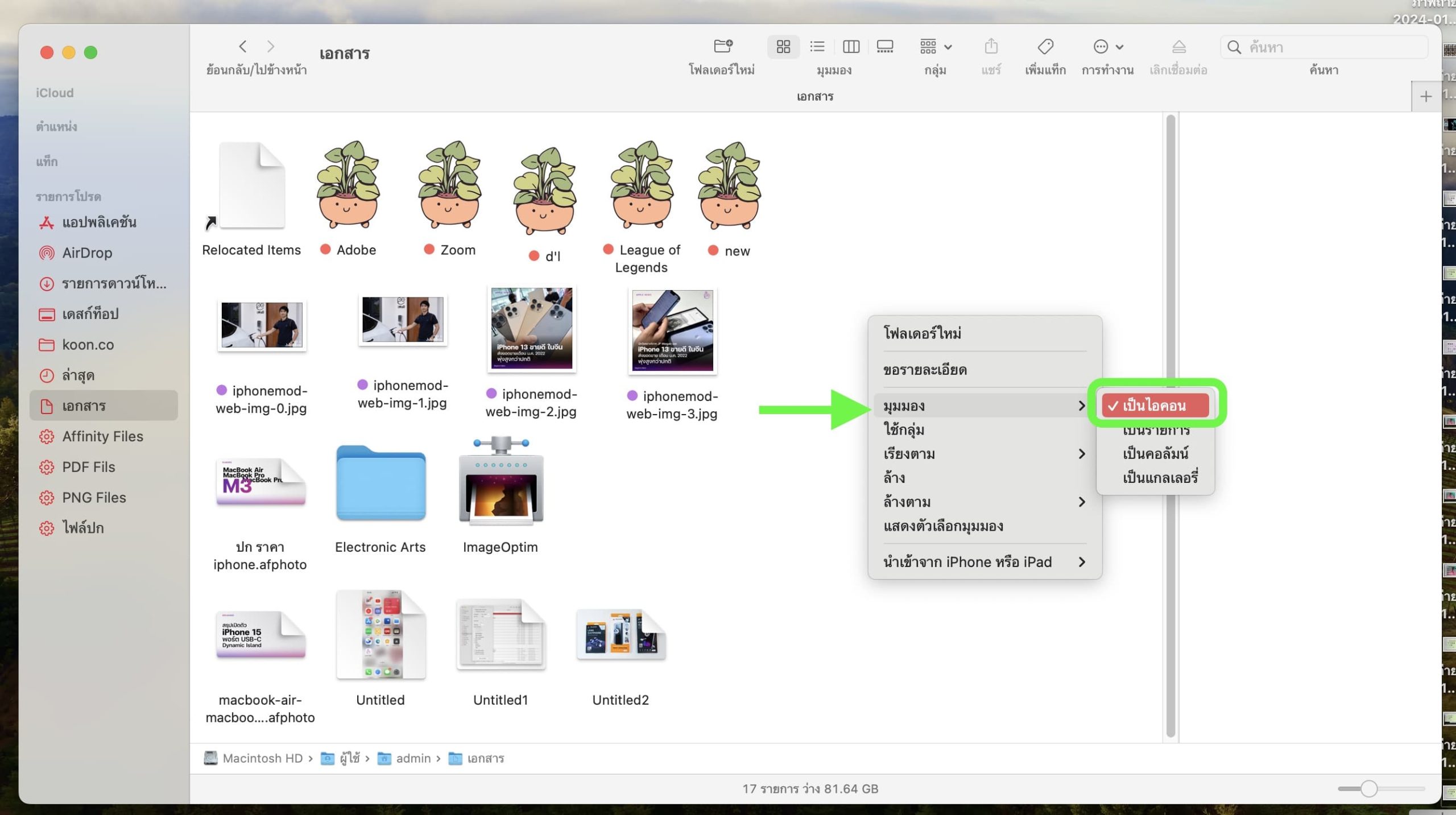 • ให้เลือกการแสดงไฟล์เป็นแบบ “ไอคอน” ก่อน
