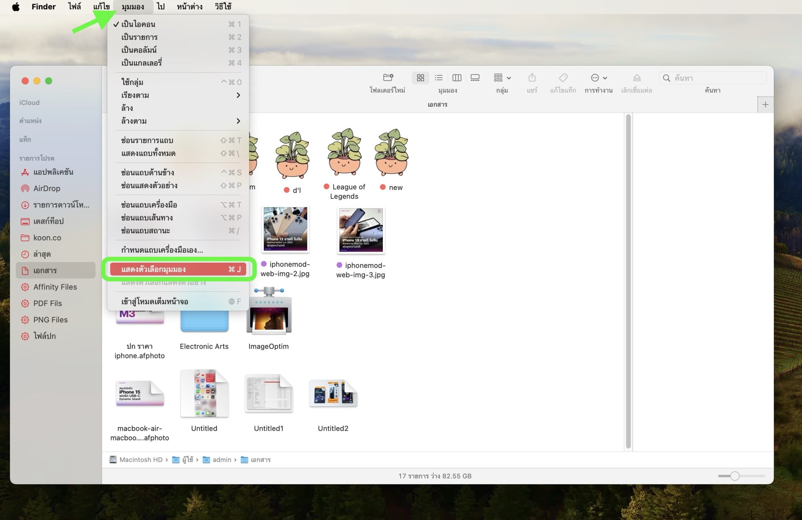 ให้เปิดไฟล์ที่อยากจะตั้งค่าก่อน จากนั้นไปที่เมนู มุมมอง > คลิกที่ แสดงตัวเลือกมุมมอง (กด Command+J ก็ได้)