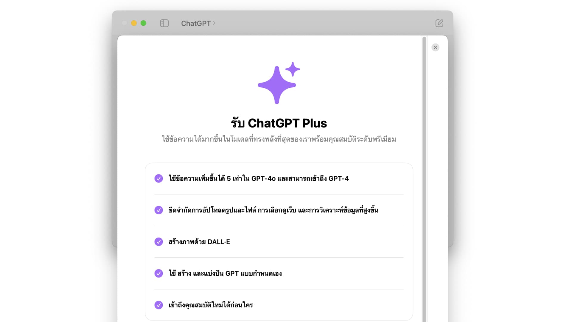 นอกจากนี้ ผู้ใช้ทุกคนสามารถใช้แอป ChatGPT-4o บน Mac ได้ฟรี โดยไม่ต้องสมัครสมาชิก แต่จะมีการจำกัดจำนวนคำขอที่สามารถใช้ได้ใน 1 วัน หากอยากใช้จำนวนที่เยอะขึ้น 5 เท่า สามารถสมัครบริการ ChatGPT Plus ที่มีราคา $20/เดือน ได้เลย