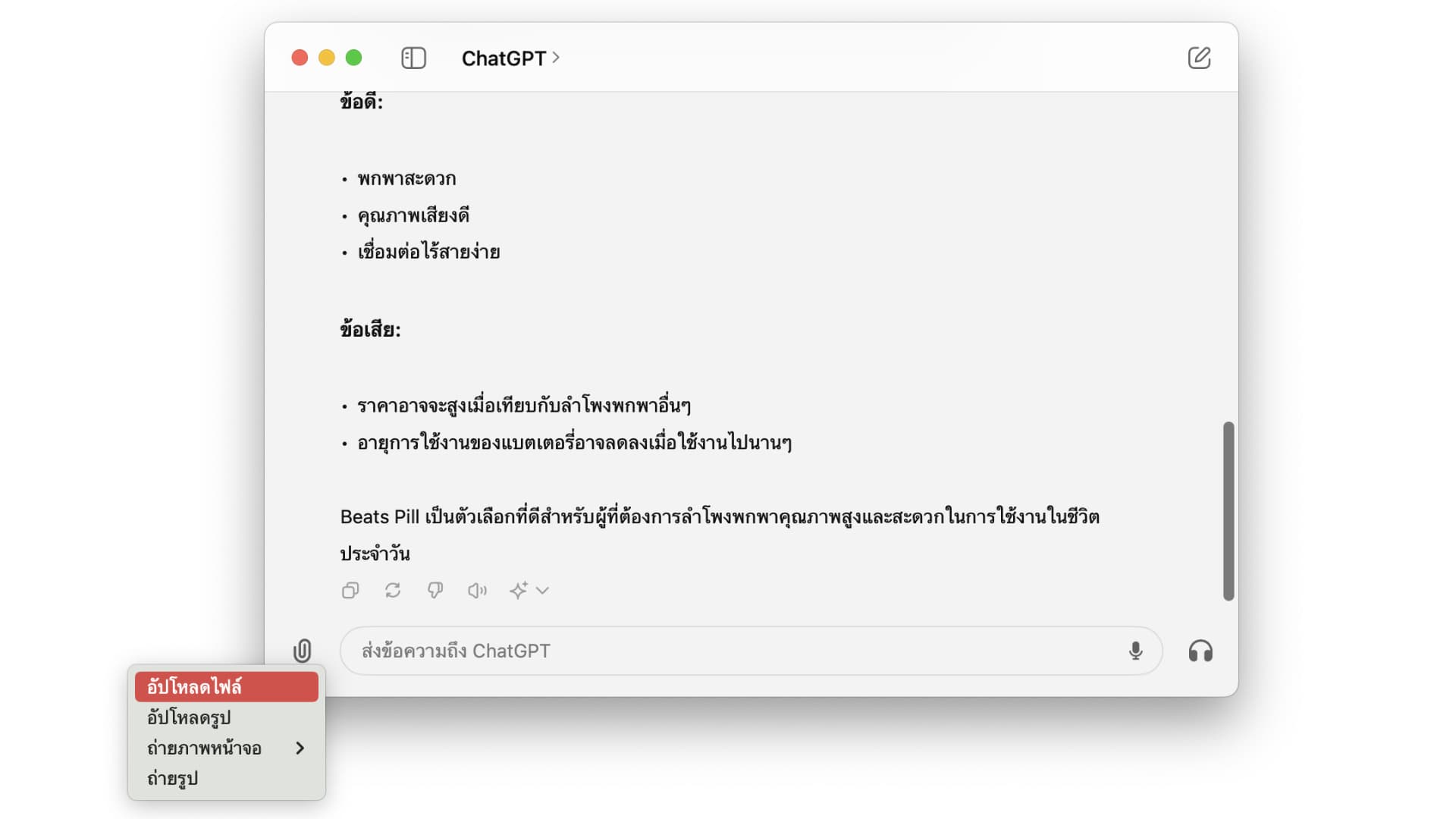 เมื่อติดตั้งลงในเครื่อง ChatGPT จะเป็นแอปแยกออกมาต่างหาก หน้าตาของแอปก็จะเป็นแบบรูปด้านล่าง มีช่องสำหรับพิมพ์ และสามารถแนบไฟล์ต่าง ๆ ได้