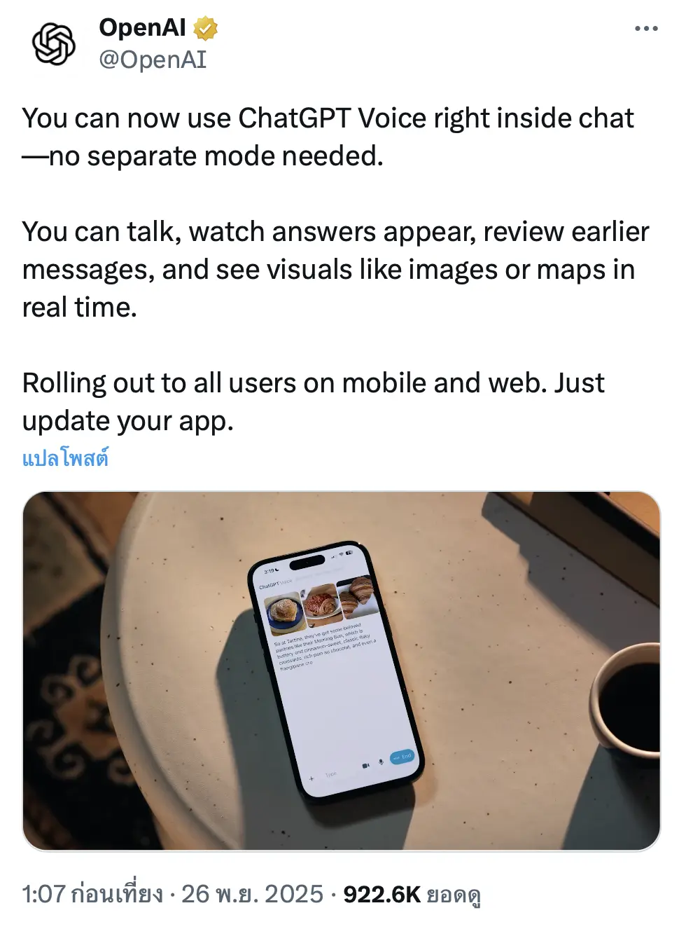 OpenAI ได้อัปเดตฟีเจอร์เสียงในแอป ChatGPT ทำให้การสนทนาด้วยเสียงเกิดขึ้นได้โดยตรงภายในบทสนทนาปัจจุบัน แทนที่ผู้ใช้จะต้องเปลี่ยนไปยังโหมดสนทนาด้วยเสียงแบบแยกต่างหากเหมือนที่ผ่านมา