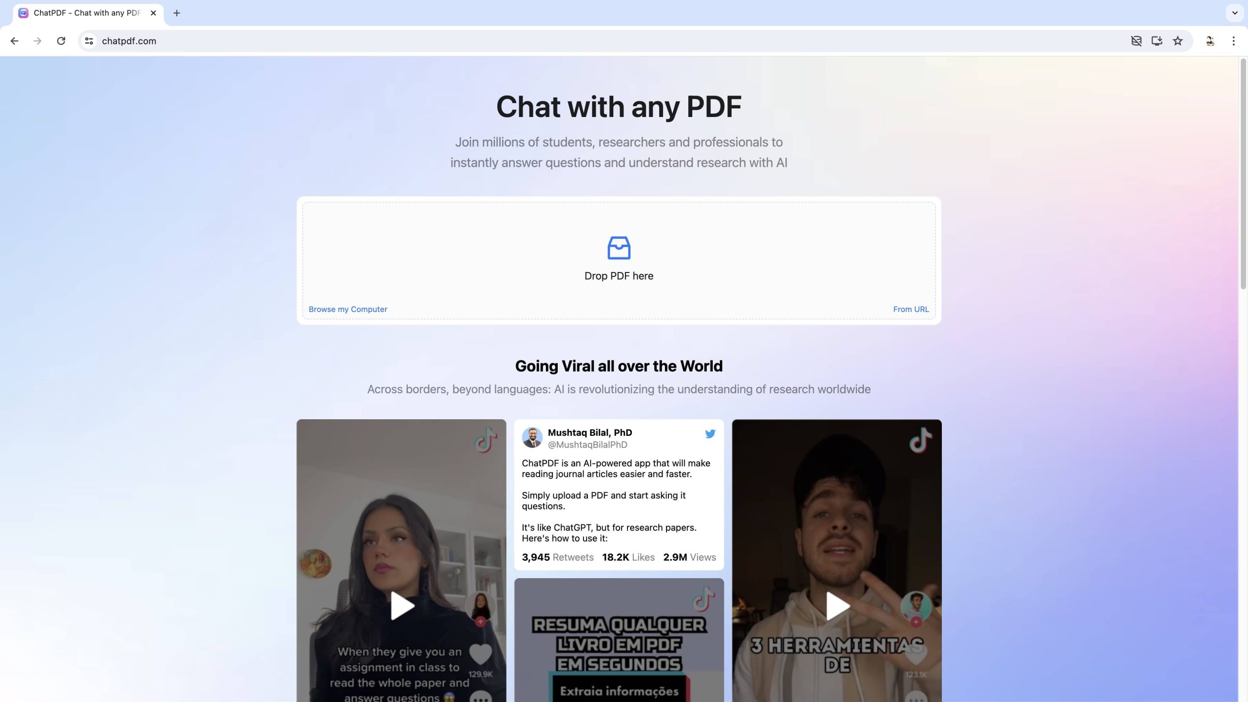 ให้เราเข้าไปที่เว็บ ChatPDF จากนั้นให้เราอัปโหลดไฟล์ PDF ที่ต้องการได้เลย หรือจะเป็นการใส่ลิงก์ก็ทำได้เหมือนกัน