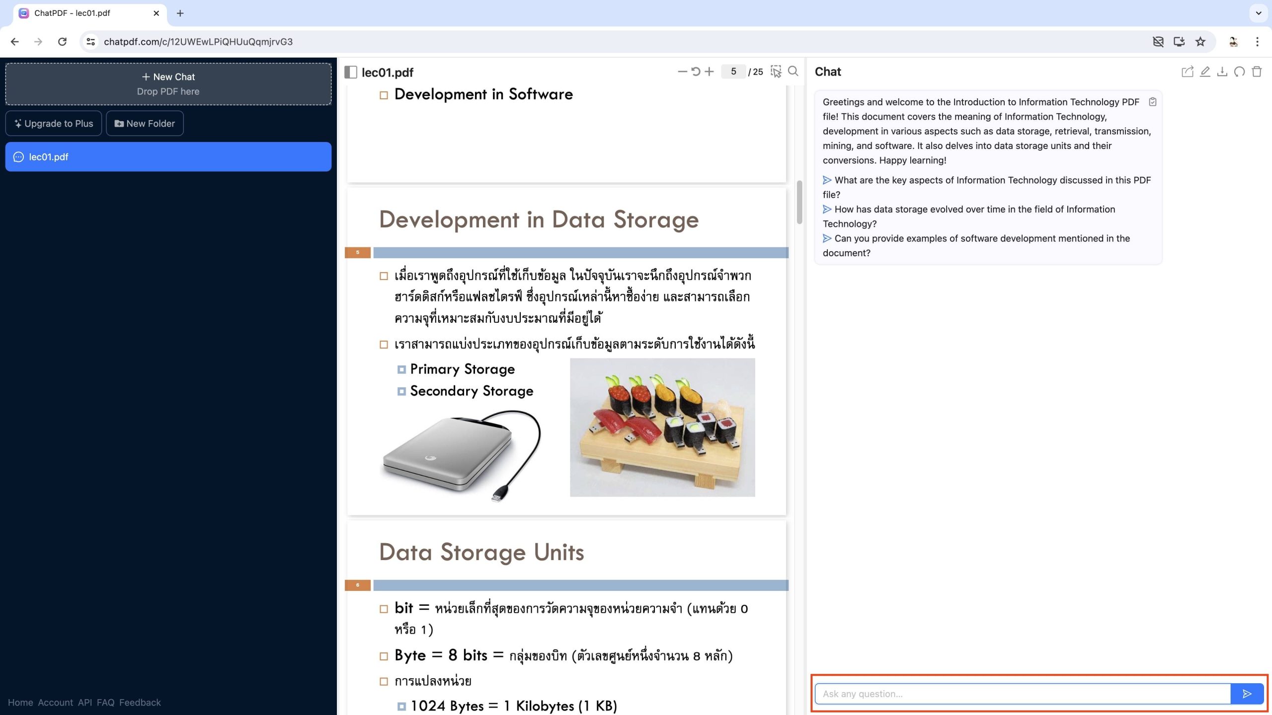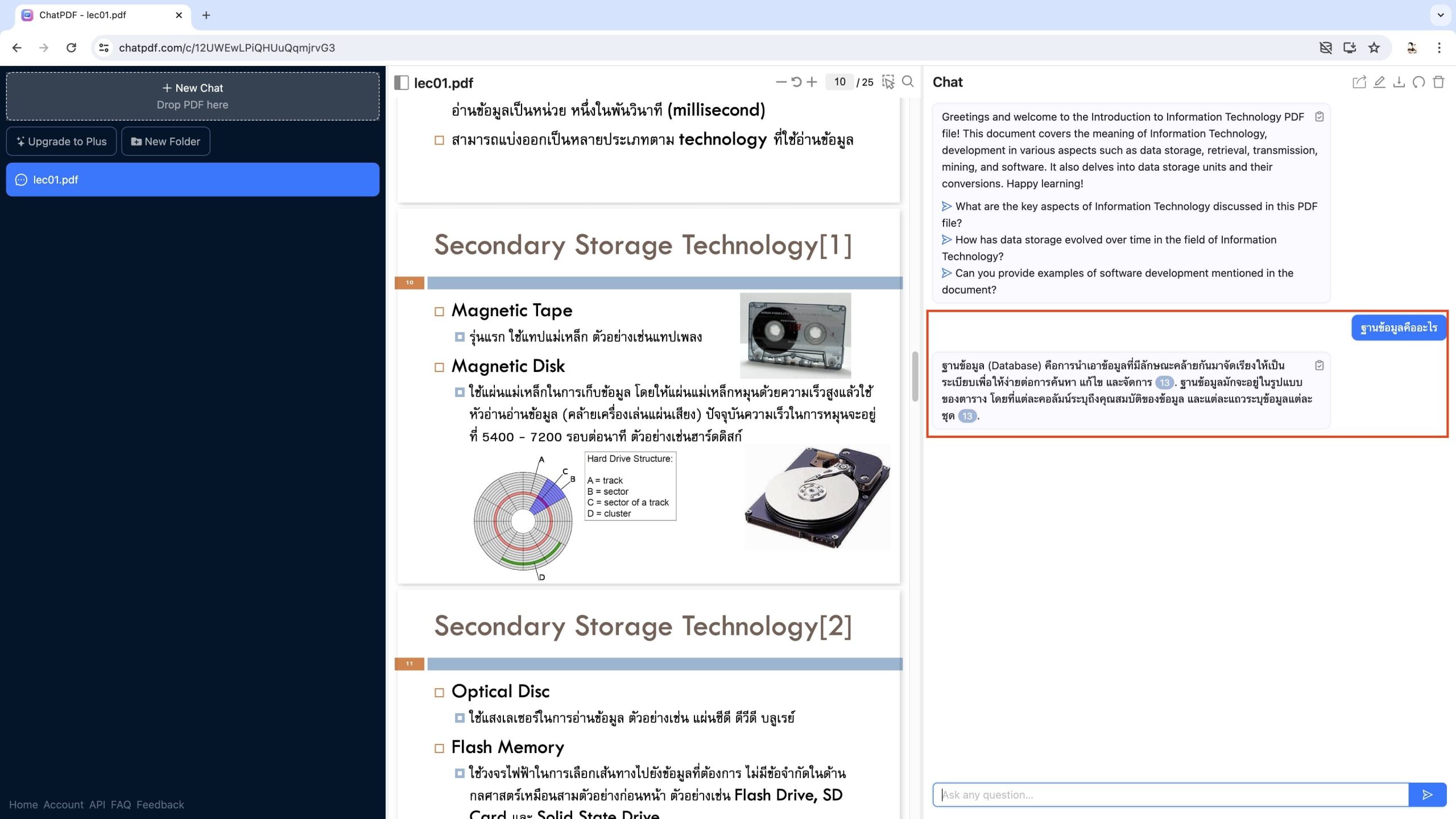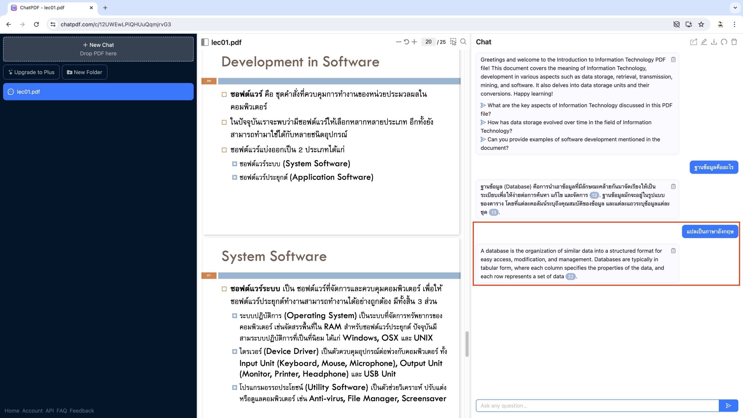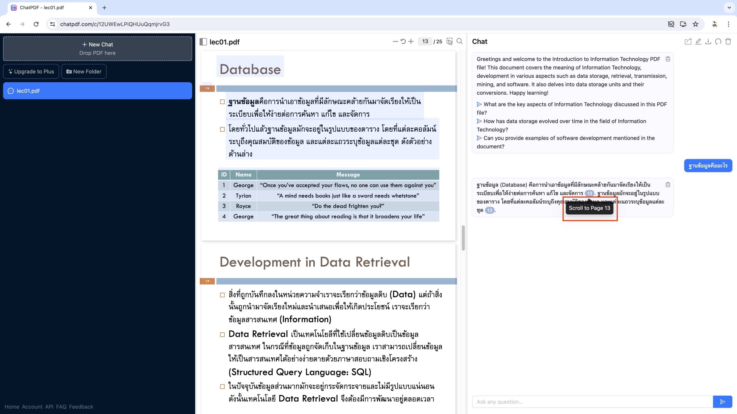 เช่น ทีมงานถามว่า ฐานข้อมูลคืออะไร จากนั้นพอรอประมวลผลสักพัก ทางเว็บไซต์ก็จะทำการค้นหาข้อมูลที่เราต้องการจากไฟล์ PDF ออกมาแล้วส่งเป็นแชทมาให้ในทันที ทีมงานคิดว่าการที่เราสามารถแชทกับไฟล์ PDF ได้ จะทำให้เราได้ข้อมูลที่ต้องการอย่างรวดเร็ว โดยที่เราไม่ต้องไปเลื่อนอ่านเพื่ออ่านข้อมูลทั้งหมดใน PDF ให้เสียเวลาเลย