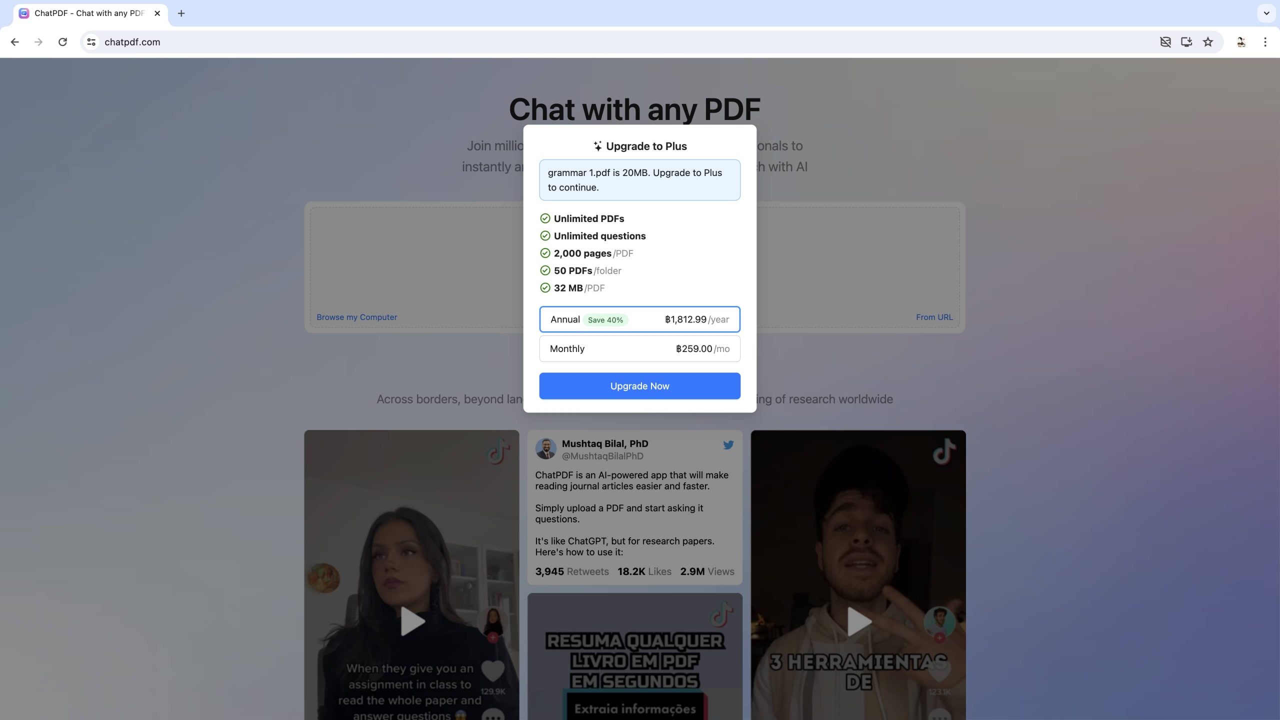 โดยที่ตัวเว็บจะให้เราอัปโหลดไฟล์ PDF แบบฟรี ๆ ได้ไม่เกิน 20MB และสามารถอัปโหลดไฟล์ PDF แบบฟรี ๆ ได้ 2 ไฟล์ต่อวันเท่านั้น!