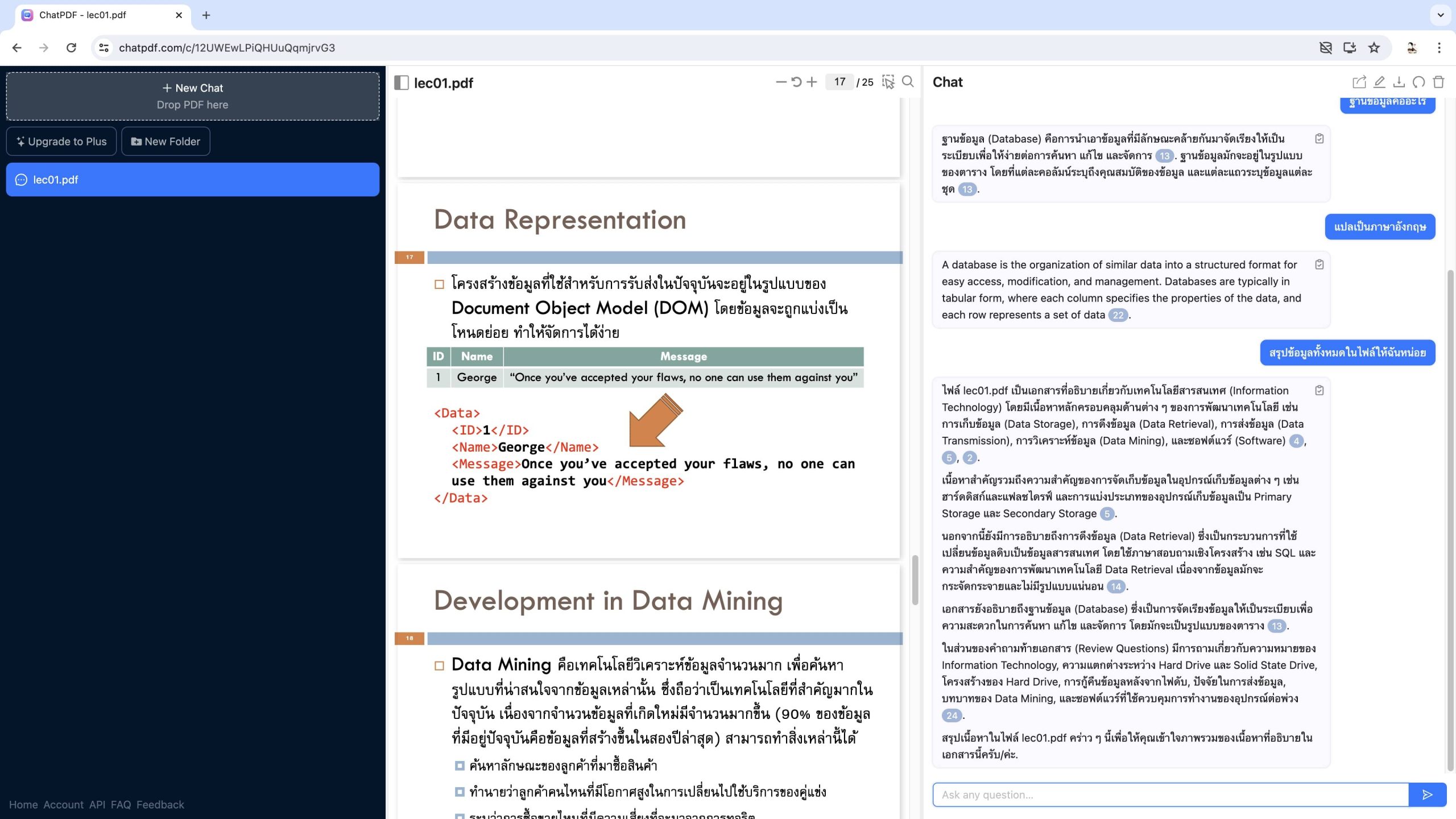 พอเราอัปโหลดไฟล์ PDF เสร็จแล้ว ก็จะแสดงหน้าไฟล์ PDF ให้เราได้ดู พร้อมกับช่องแชทที่ให้เราสามารถถามคำถามของข้อมูลในไฟล์ PDF ที่ต้องการได้
