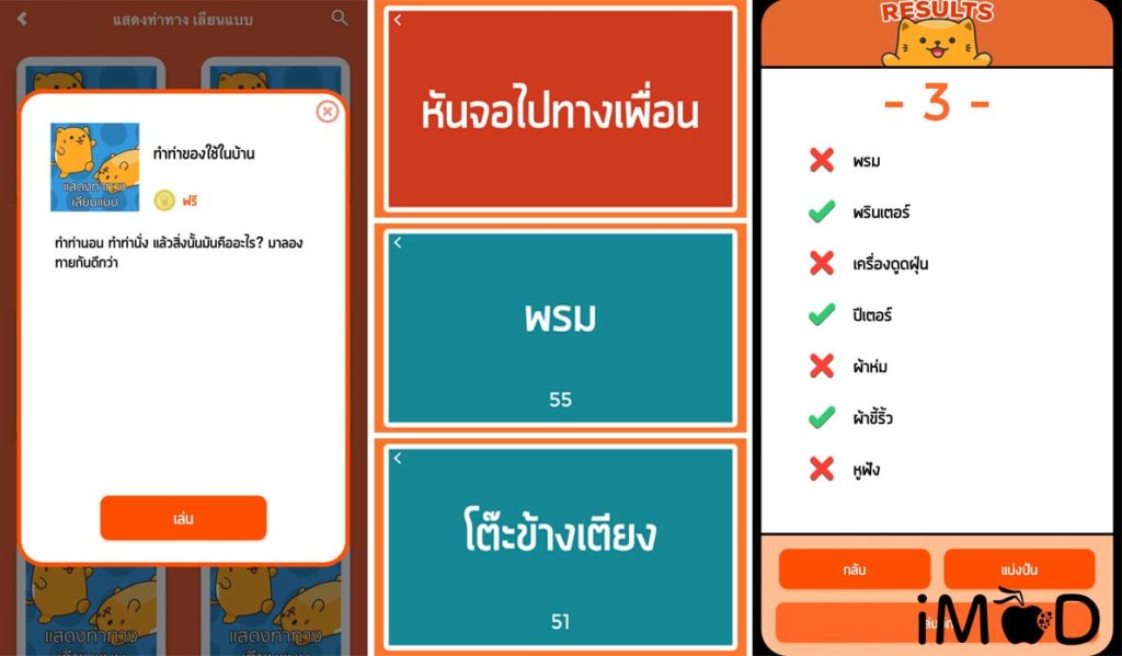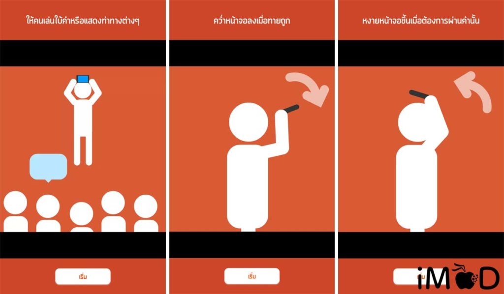 วิธีเล่น เลือกหมวดหมู่ที่ต้องการ แล้วหันหน้าจอไปทางเพื่อน (ผู้ใบ้คำ) เพื่อนต้องทำท่าทางในการให้คำใบ้ หากเราตอบถูกให้เราคว่ำหน้าจอลง (เพื่อนต้องเป็นคนบอกว่าเราถูกหรือผิด) หากเราตอบผิดหรือตอบไม่ได้แล้วต้องการข้ามให้หงายหน้าจอขึ้น เกมจะแสดงคะแนนเมื่อจบเกม ดังรูปด้านล่างนี้