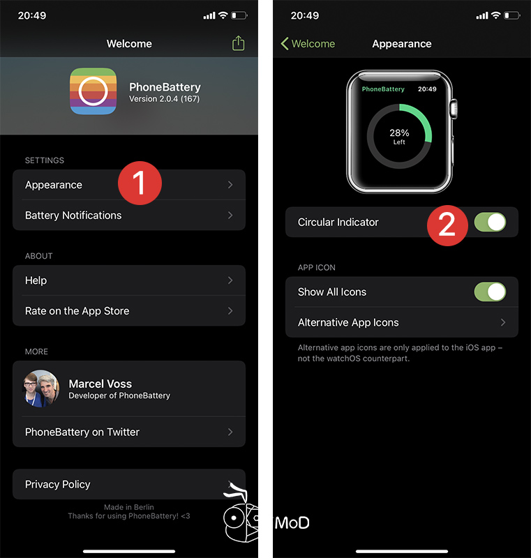 นอกจากนี้เรายังสามารถตั้งค่าการแสดงผลในแอป PhoneBattery บน iPhone ได้ว่าจะให้แสดงเป็นรูปแบบแบตเตอรี่หรือแบบวงกลม