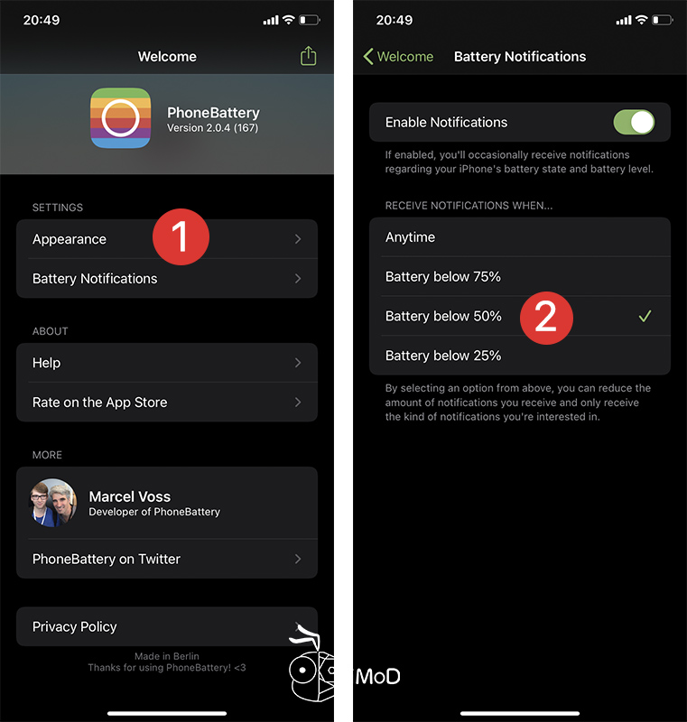 และสามารถตั้งค่าการแจ้งเตือนแบตเตอรี่คงเหลือของ iPhone ได้ เช่น ถ้าแบตเหลือน้อยกว่า 50% ให้แจ้งเตือนให้ทราบ เพื่อให้เรานำ iPhone ไปชาร์จต่อ หรืออาจะเปิดโหมดประหยัดแบต เมื่อต้องการ
