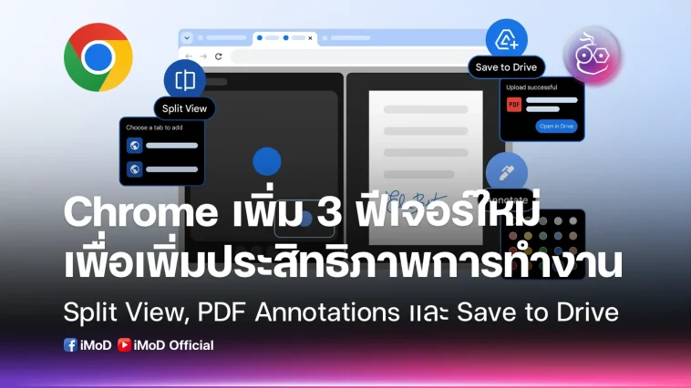 Google Chrome ประกาศอัปเดตฟีเจอร์ใหม่ 3 อย่างที่ออกแบบมาเพื่อเพิ่มประสิทธิภาพการทำงาน ทั้ง Split View ที่ให้ดูสองแท็บพร้อมกัน, PDF Annotations ที่จดบันทึกบน PDF ได้ และ Save to Google Drive ที่บันทึกไฟล์ตรงไปที่ Drive โดยตรง