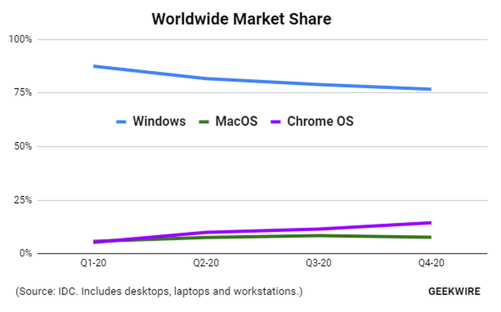 รายงานจาก GeekWire เผยว่าเมื่อปี 2020 ที่ผ่านมาสัดส่วนตลาดอุปกรณ์อย่าง คอมพิวเตอร์, โน้ตบุค, แล็ปท็อป แข่งขันกันอย่างดุเดือด โดย Windows ครองส่วนแบ่งสูงสุดแต่ลดลง 4.9% เมื่อเทียบกับปีก่อนหน้า, Mac ของ Apple เพิ่มขึ้นจาก 6.9% เป็น 7.5%