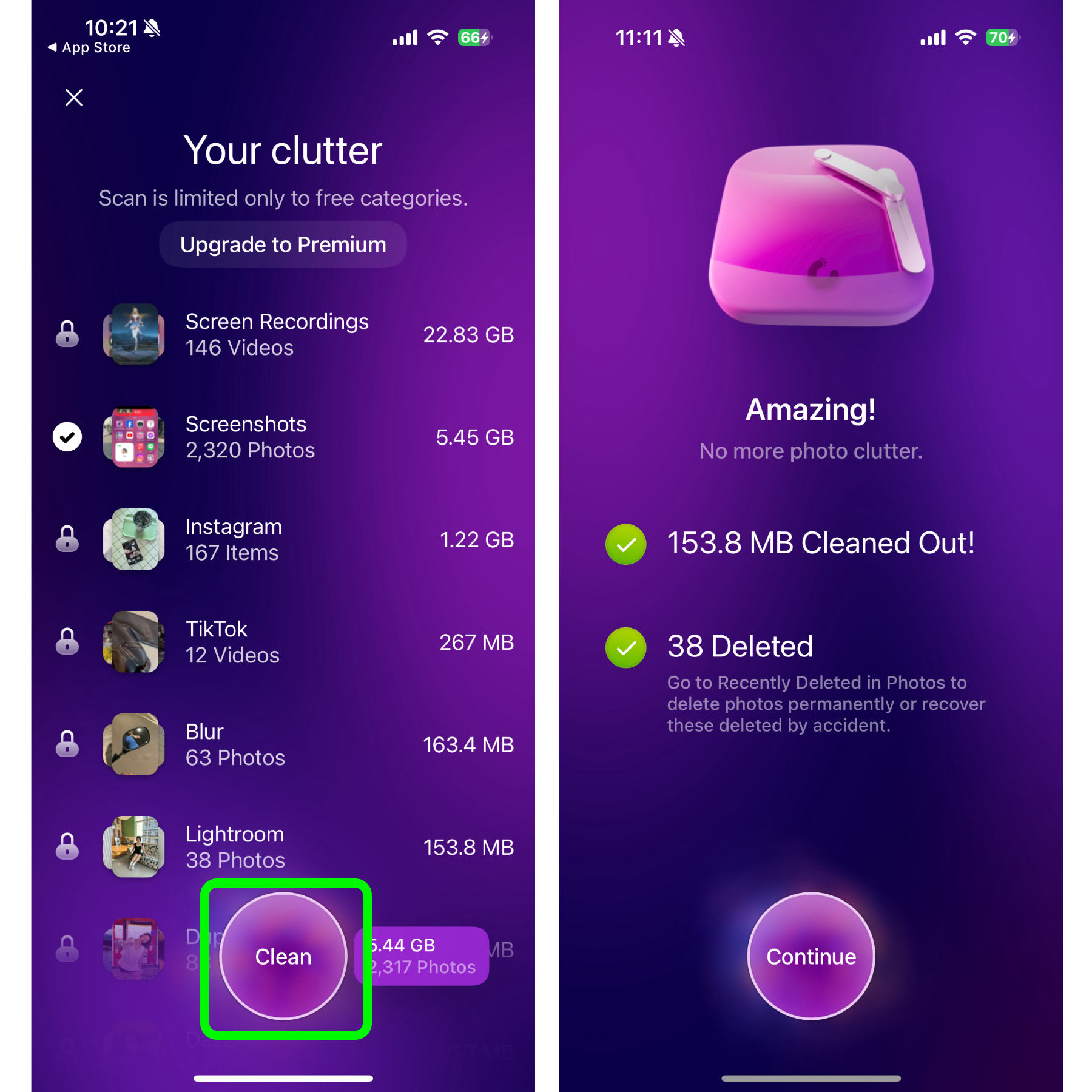 - Declutter (จัดระเบียบ): สแกนรูปภาพทั้งหมดในคลังเพื่อหาไฟล์ที่ไม่จำเป็น เช่น รูปภาพซ้ำ, ภาพเบลอ, วิดีโอสั้น, และอื่น ๆ