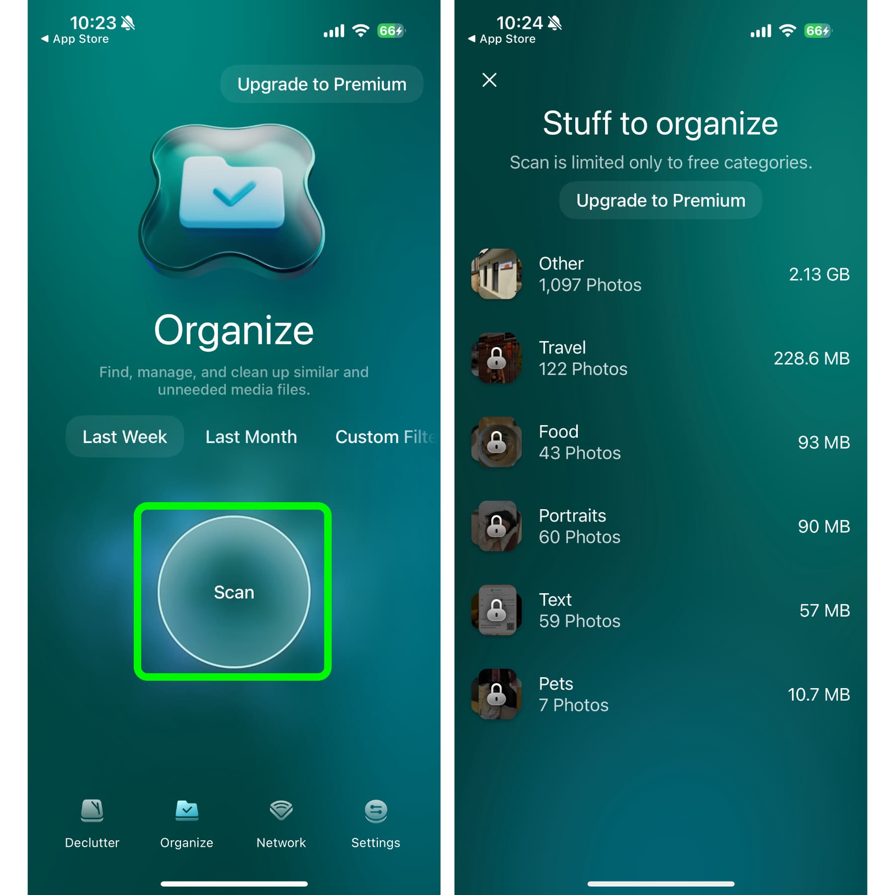ฟีเจอร์นี้จะมีเมนูเป็นสีเขียว เลือกช่วงเวลาที่อยากจัดระเบียบได้ เช่น สัปดาห์ที่แล้ว เดือนที่แล้ว หรือจะเลือกเองทั้งหมดก็ได้ ให้เรากด “Scan” เพื่อให้แอปทำงาน หลังจากนั้นก็จะมีการจัดระเบียบประเภทรูปภาพให้ตามรูปด้านล่าง เราสามารถเลือกจัดรัเบียบได้ตามต้องการเลย