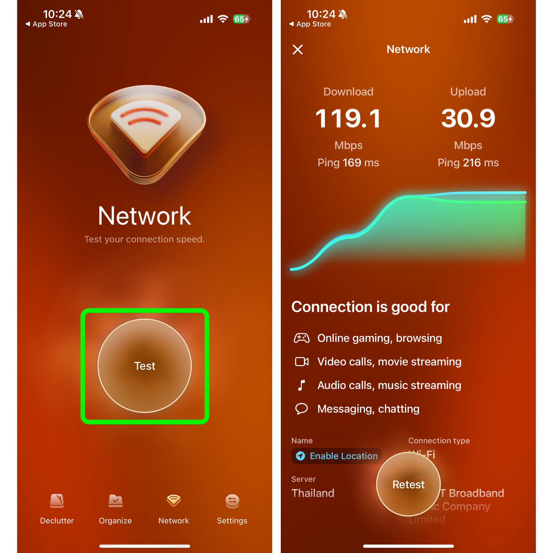 ฟีเจอร์นี้จะมีเมนูเป็นสีส้ม ลองทดสอบความเร็วอินเทอร์เน็ตของคุณได้ง่าย ๆ เพียงกดที่ปุ่ม “Test” หลังจากนั้นตัวแอปก็จะทำการสแกนซักพัก แล้วเราก็จะได้รู้ว่าเน็ตที่เราใช้งานอยู่มีความเร็วในการดาวน์โหลดและอัปโหลดเท่าไหร่