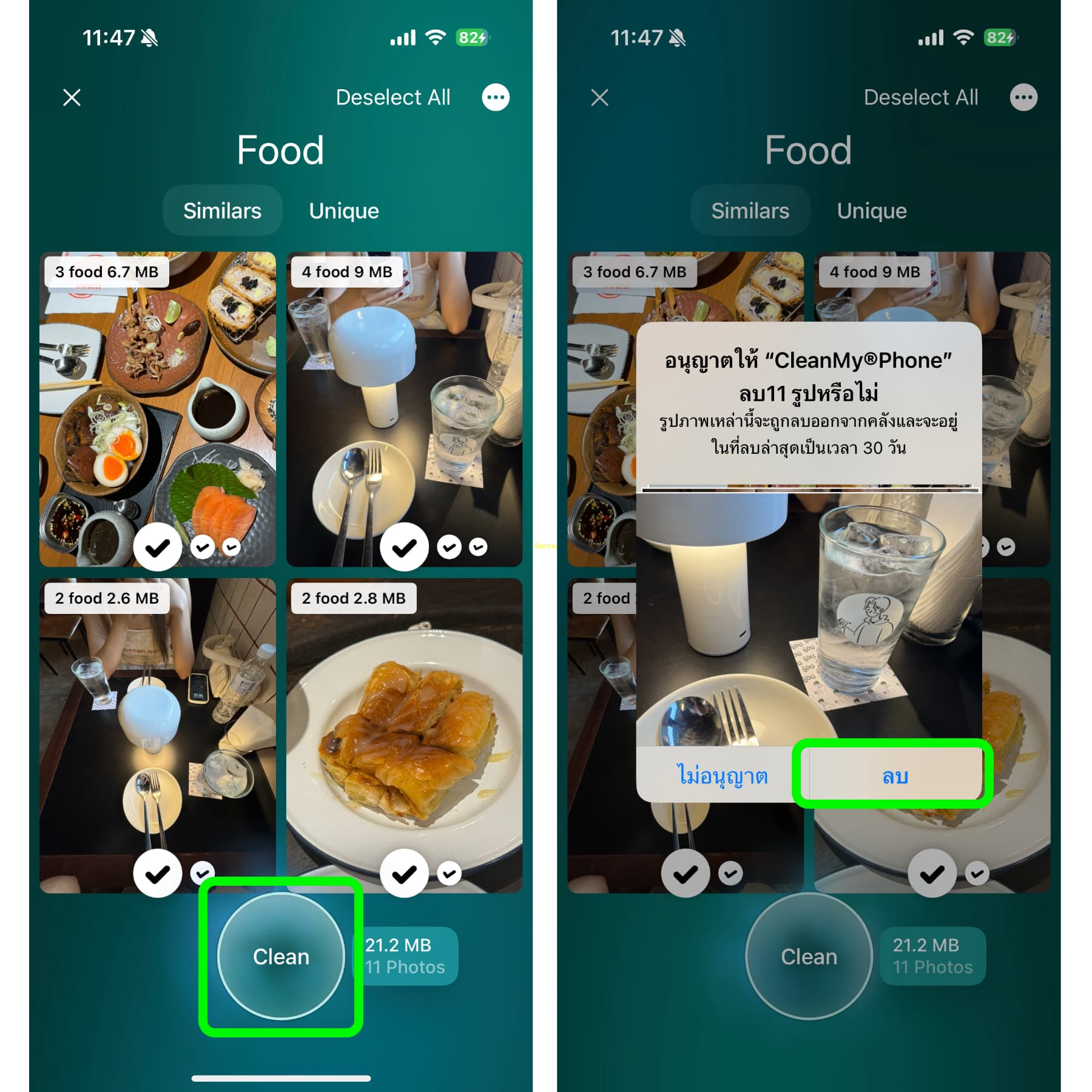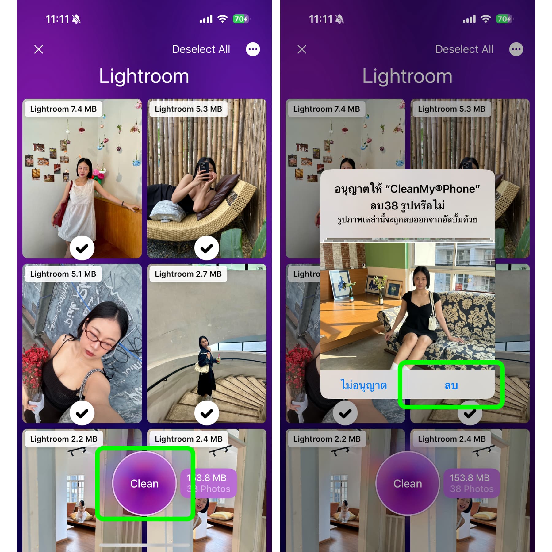 พอสแกนเสร็จก็จะมีข้อมูลบอกประเภทของไฟล์รูปและวิดีโอ เช่นไฟล์แคปหน้าจอ ไฟล์อัดหน้าจอที่เราปล่อยให้รกเครื่อง ให้เราเลือกไฟล์ประเภทที่ต้องการ (สามารถกดเข้าไปดูได้ว่ามีรูปอะไรบ้าง) เมื่อตรวจดูแล้วก็กด “Clean” เพื่อทำการลบได้เลย