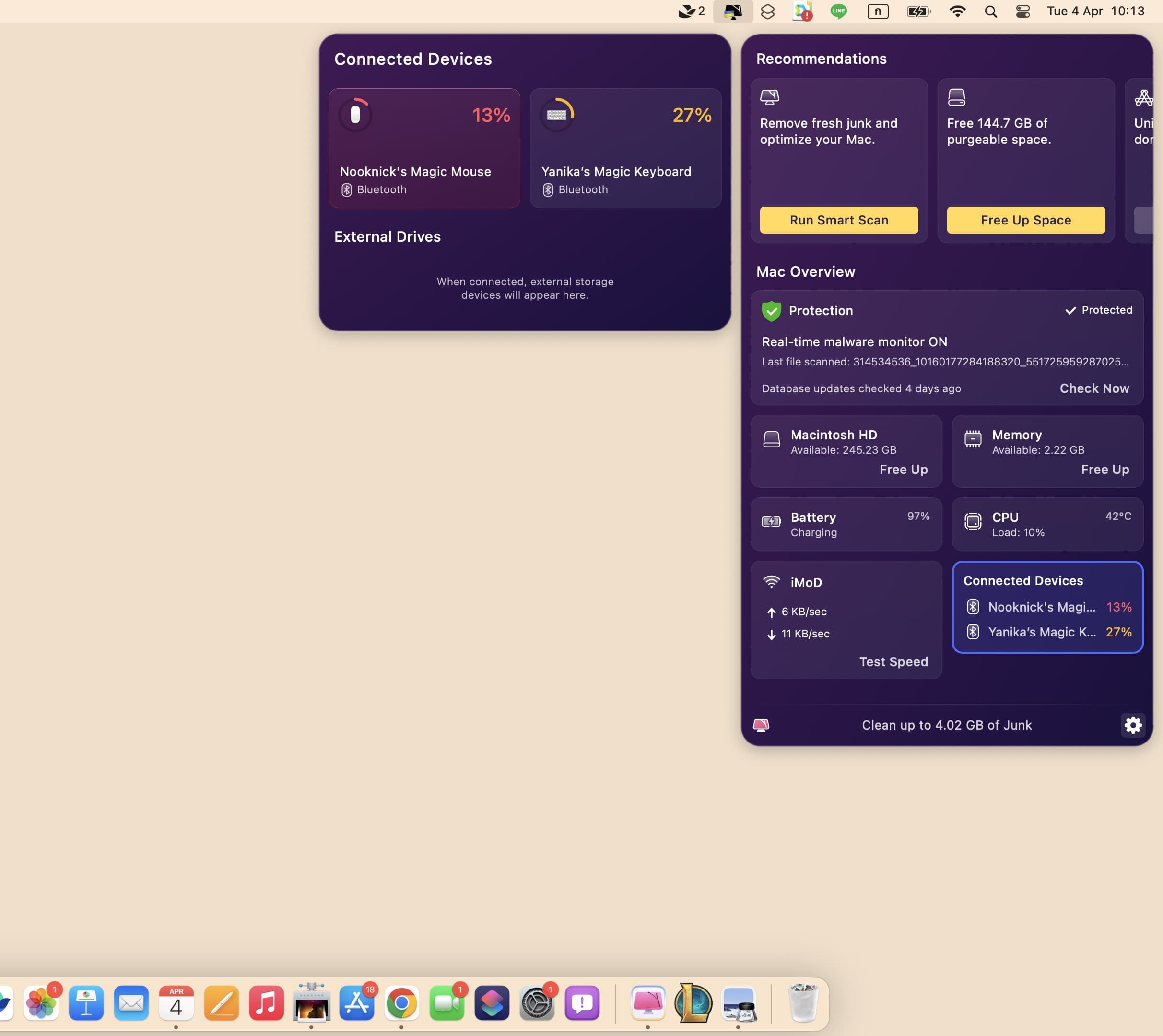 แอป CleanMyMac X ปล่อยอัปเดตซอฟต์แวร์เวอร์ชัน 4.13.0 เพิ่มฟีเจอร์ “Connected Devices Monitor” ที่มาพร้อมกับการดูอุปกรณ์เสริมเช่น เมาส์ คีย์บอร์ด ลำโพงที่กำลังเชื่อมต่ออยู่กับ Mac ผ่าน Bluetooth, WiFi รวมถึงการเสียบสาย USB ซึ่งจะมีการบอกระดับแบตเตอรี่เป็นเปอร์เซ็นต์เพื่อให้เราเตรียมตัวชาร์จอุปกรณ์เสริมให้พร้อมกำการทำงานอยู่เสมอ