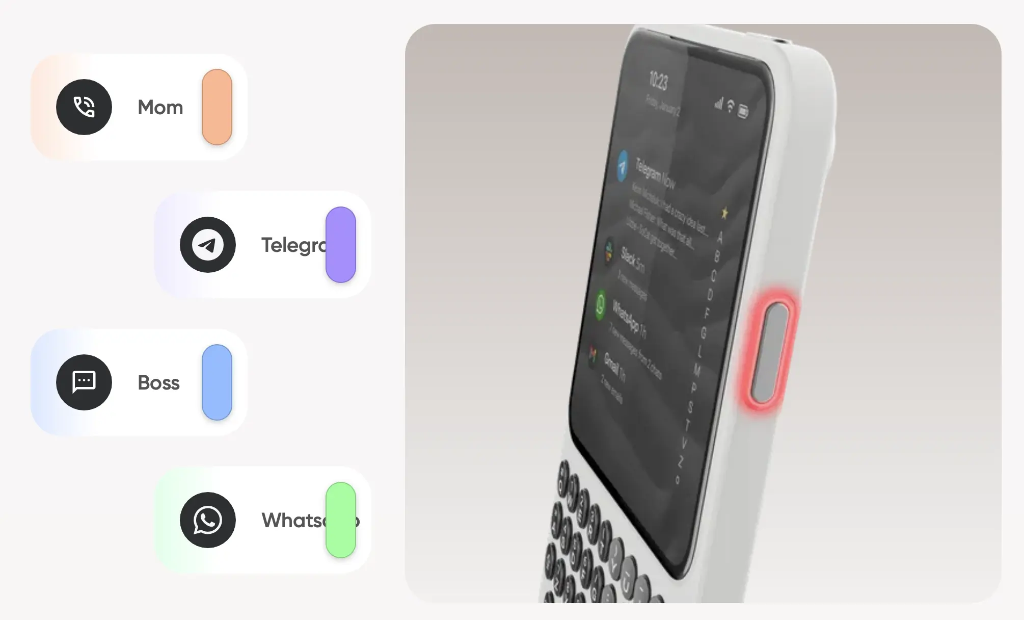 เช่นเดียวกับ Clicks Keyboard ตัวเครื่อง Clicks Communicator มาพร้อมแป้นพิมพ์แบบกายภาพ และมีปุ่ม “Prompt Key” ด้านข้างสำหรับกดค้างเพื่อสั่งข้อความเสียง