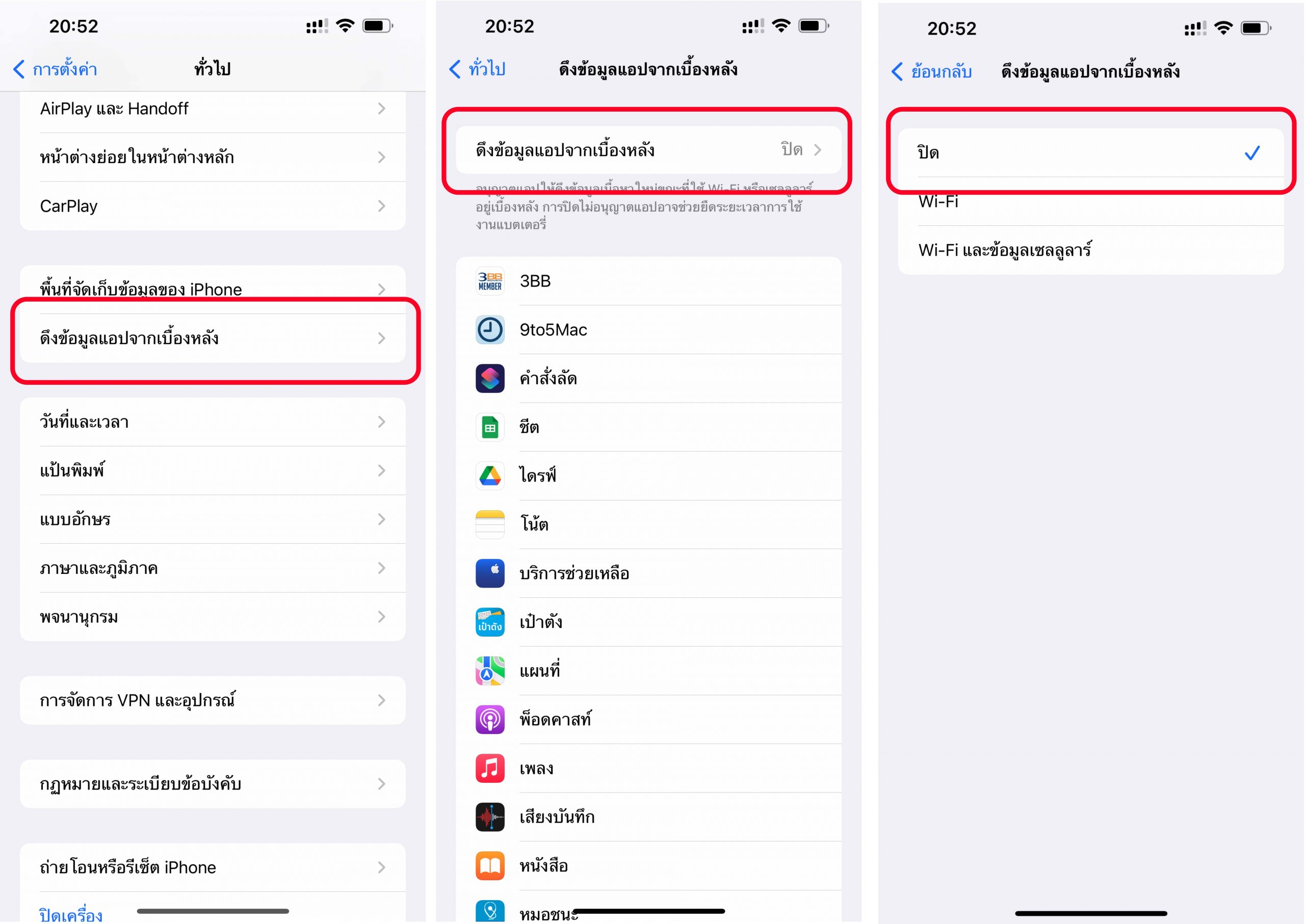 การปิด Background App Refresh ช่วยประหยัดแบตได้ ไปที่การตั้งค่า > ทั่วไป > ดึงข้อมูลใหม่ให้แอปอยู่เบื้องหลัง > ปิดตามต้องการ