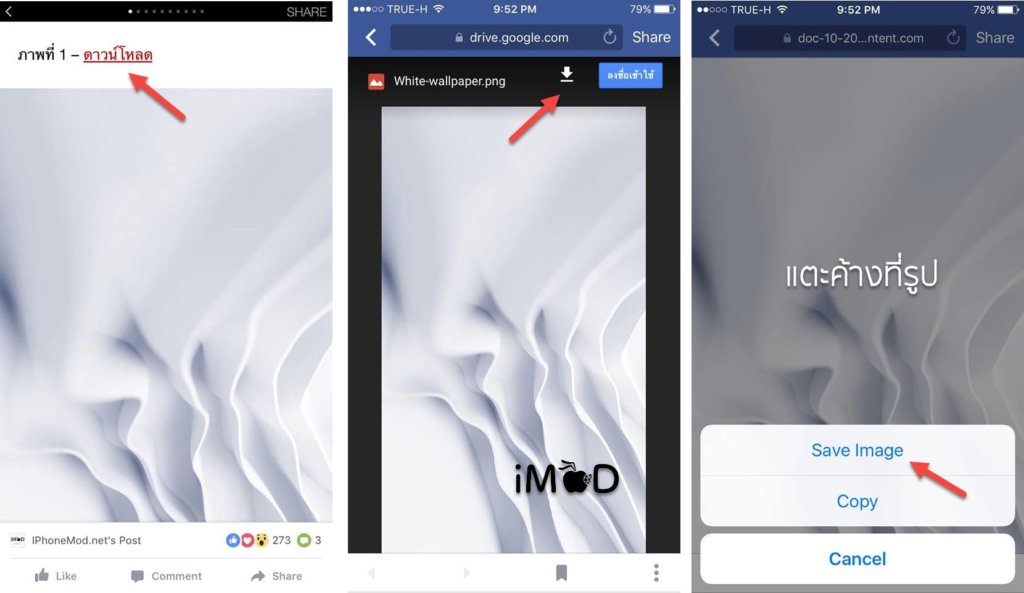 กดดาวน์โหลดที่ลิงก์ “ดาวน์โหลด” ด้านบนรูปภาพ > แตะไอคอนดาวน์โหลด > แตะที่ภาพค้างไว้ > Save Image