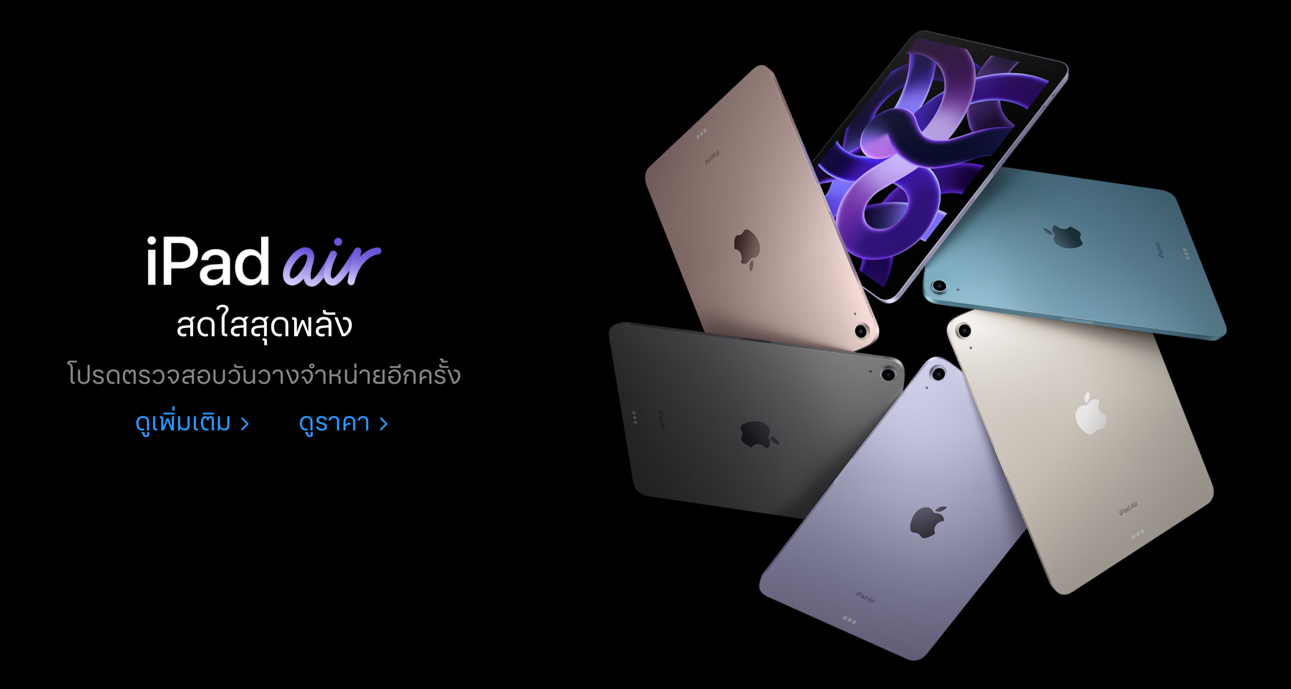 - iPad Air 5 : มาพร้อม 5 สี ได้แก่ สีเทาสเปซเกรย์, สีสตาร์ไลท์, สีชมพู, สีม่วง และ สีฟ้า