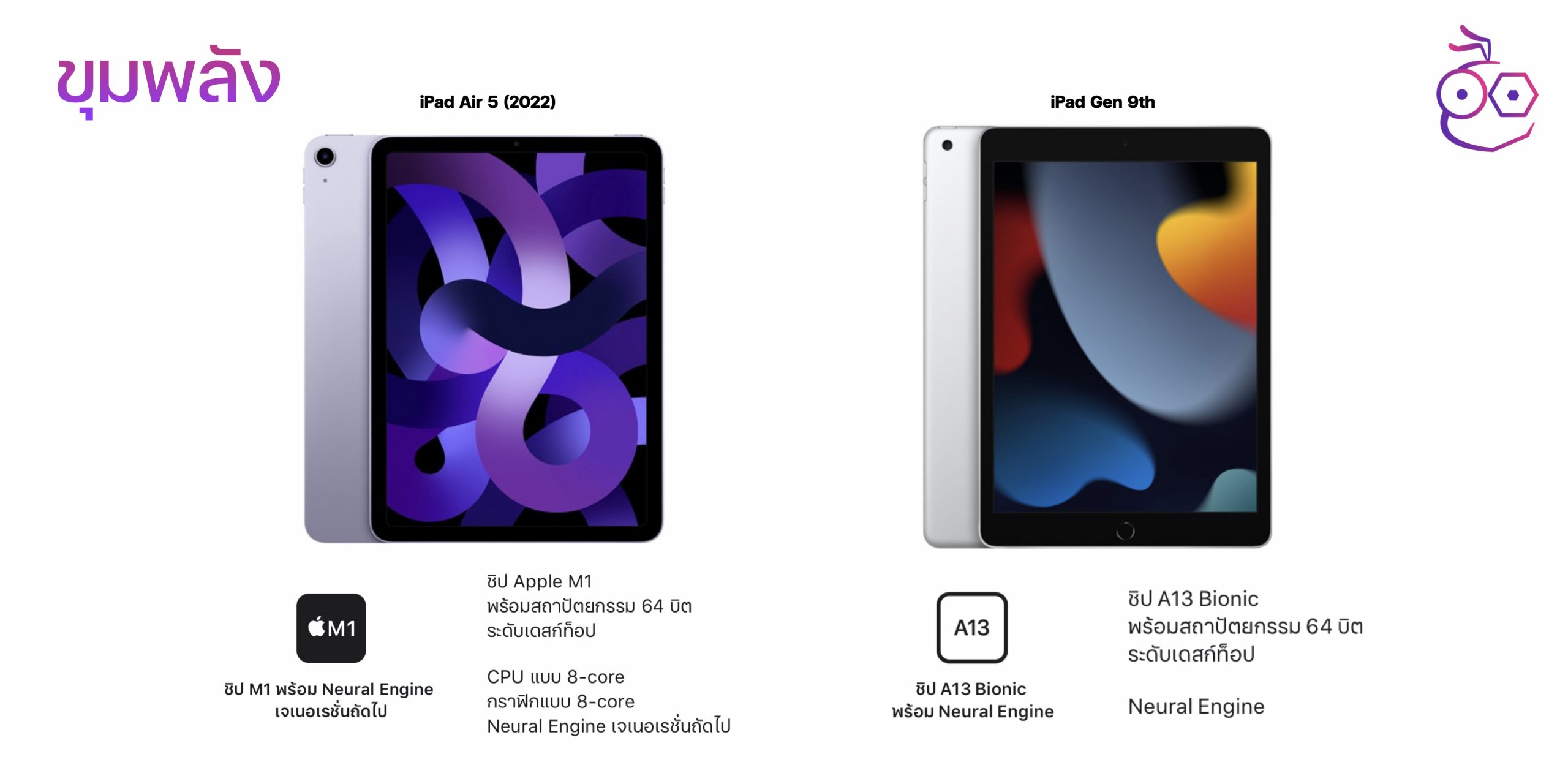 - iPad Air 5 : ชิป M1 CPU 8-Core, GPU 8-Core, Neural Engine แบบ 16‑core