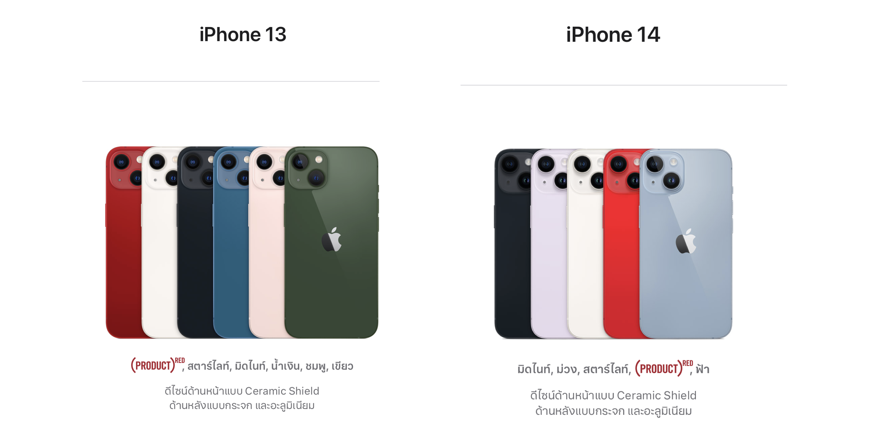 iPhone 13 มีทั้งหมด 6 สีให้เลือก ทางฝั่ง iPhone 14 มีทั้งหมด 5 สีให้เลือก โดยมีความแตกต่างของราคาอยู่ที่ 3,000 บาท