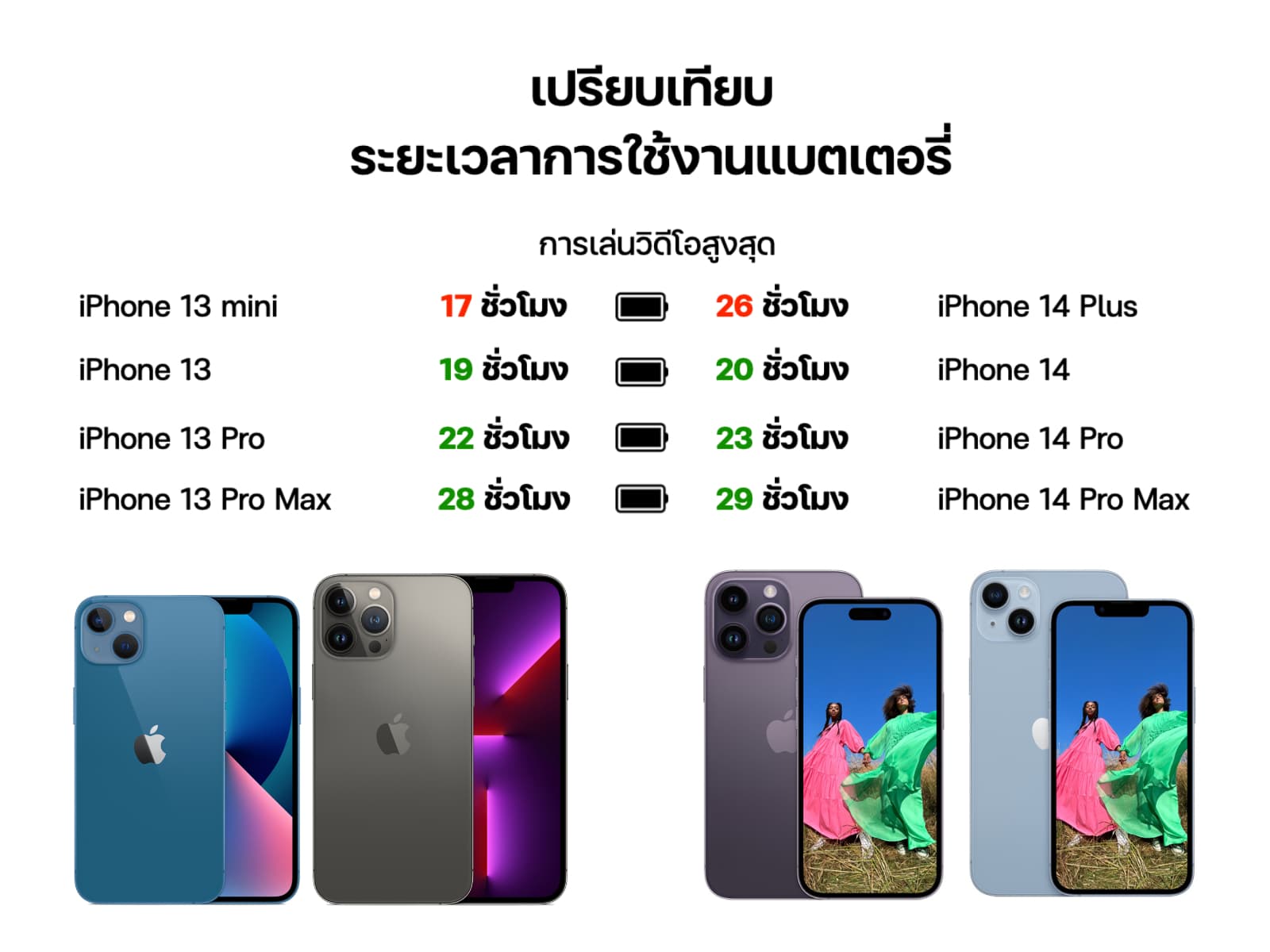 ทีมงานนำข้อมูลเปรียบเทียบระยะเวลาการใช้งานแบตเตอรี่ iPhone 14 และ iPhone 13 มาให้ชม โดยยึดข้อมูลจาก Apple มาชมกันว่า iPhone รุ่นไหนมีแบตให้ใข้งานมากกว่า ง