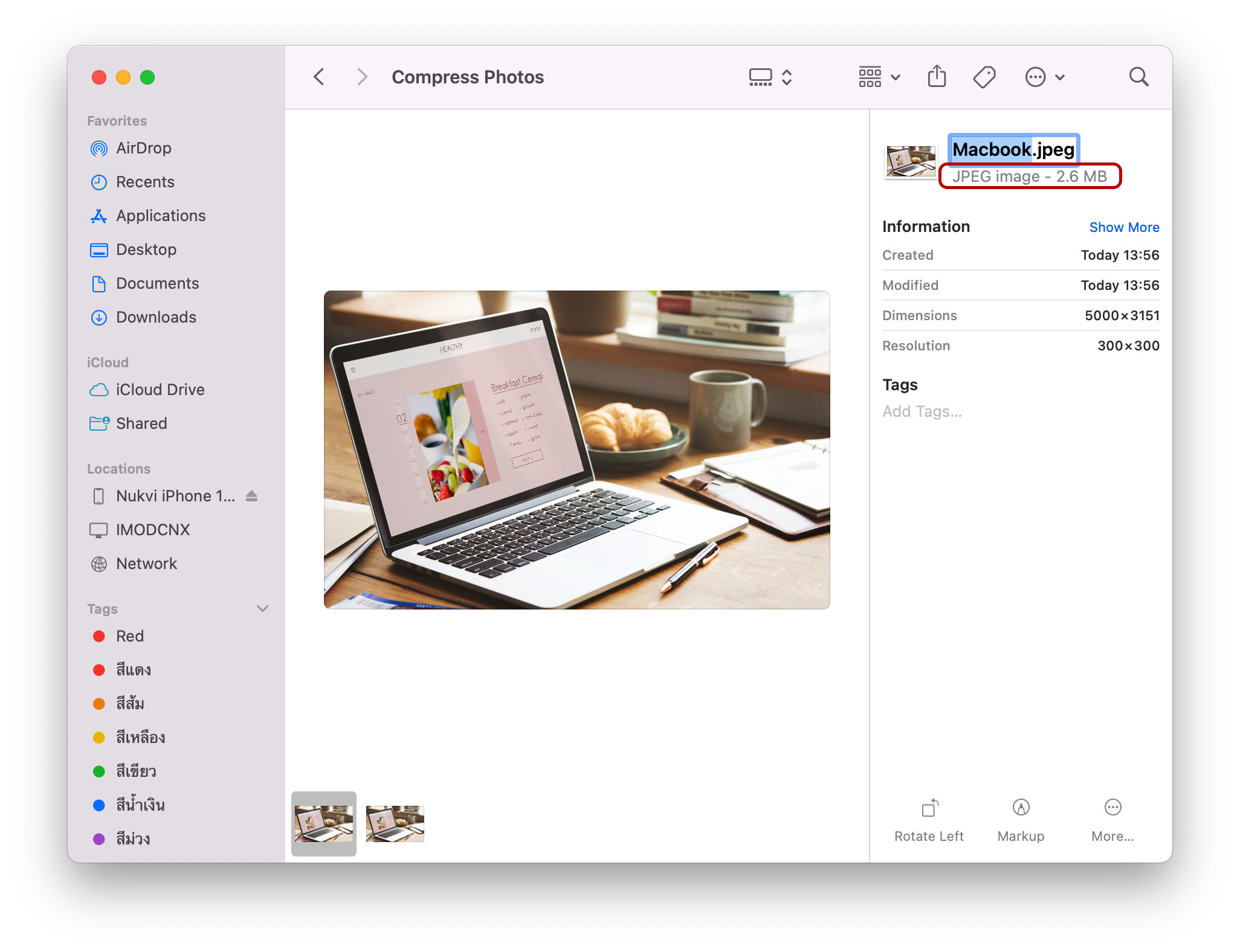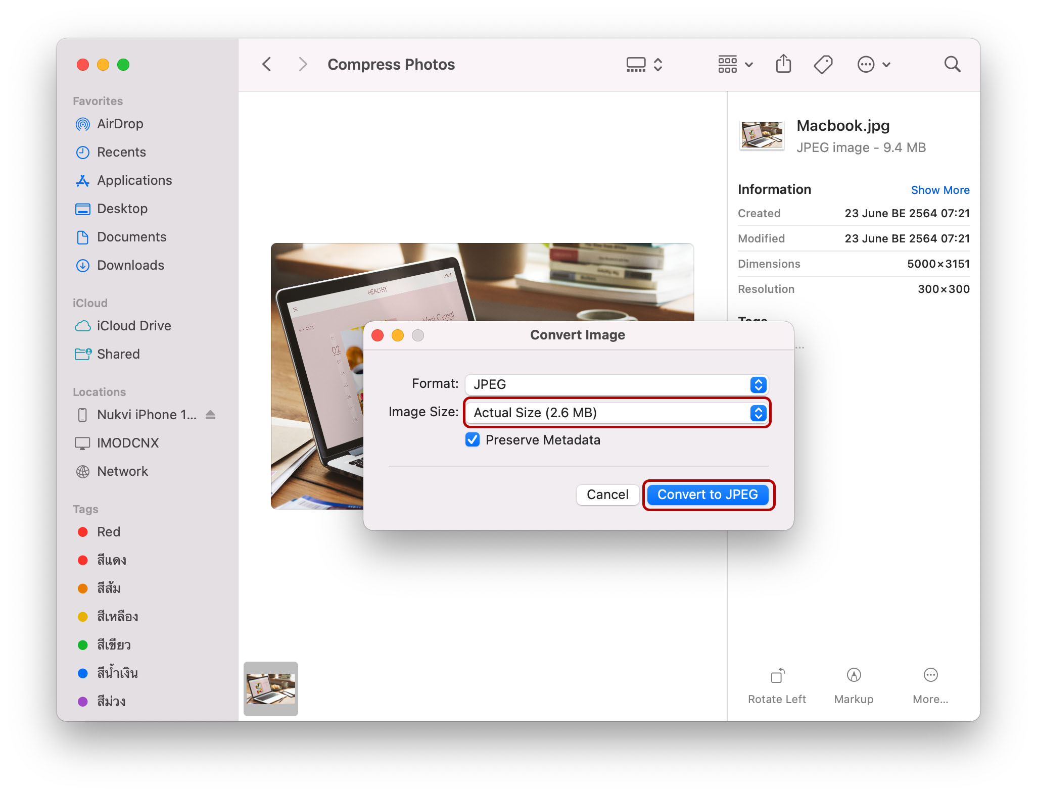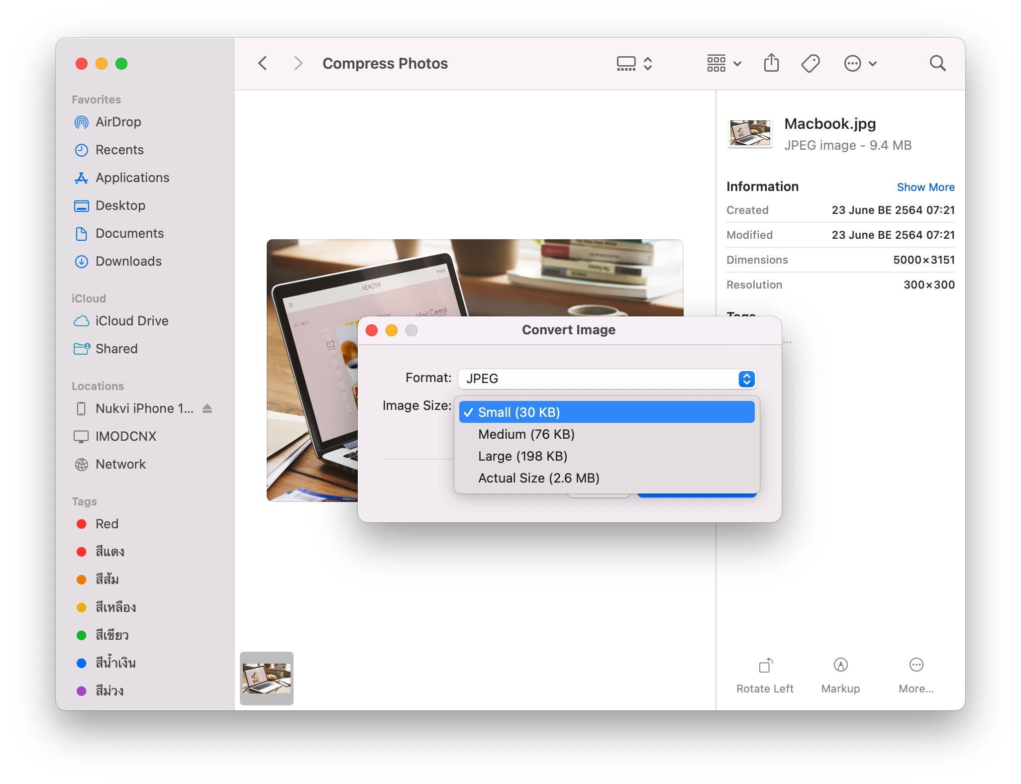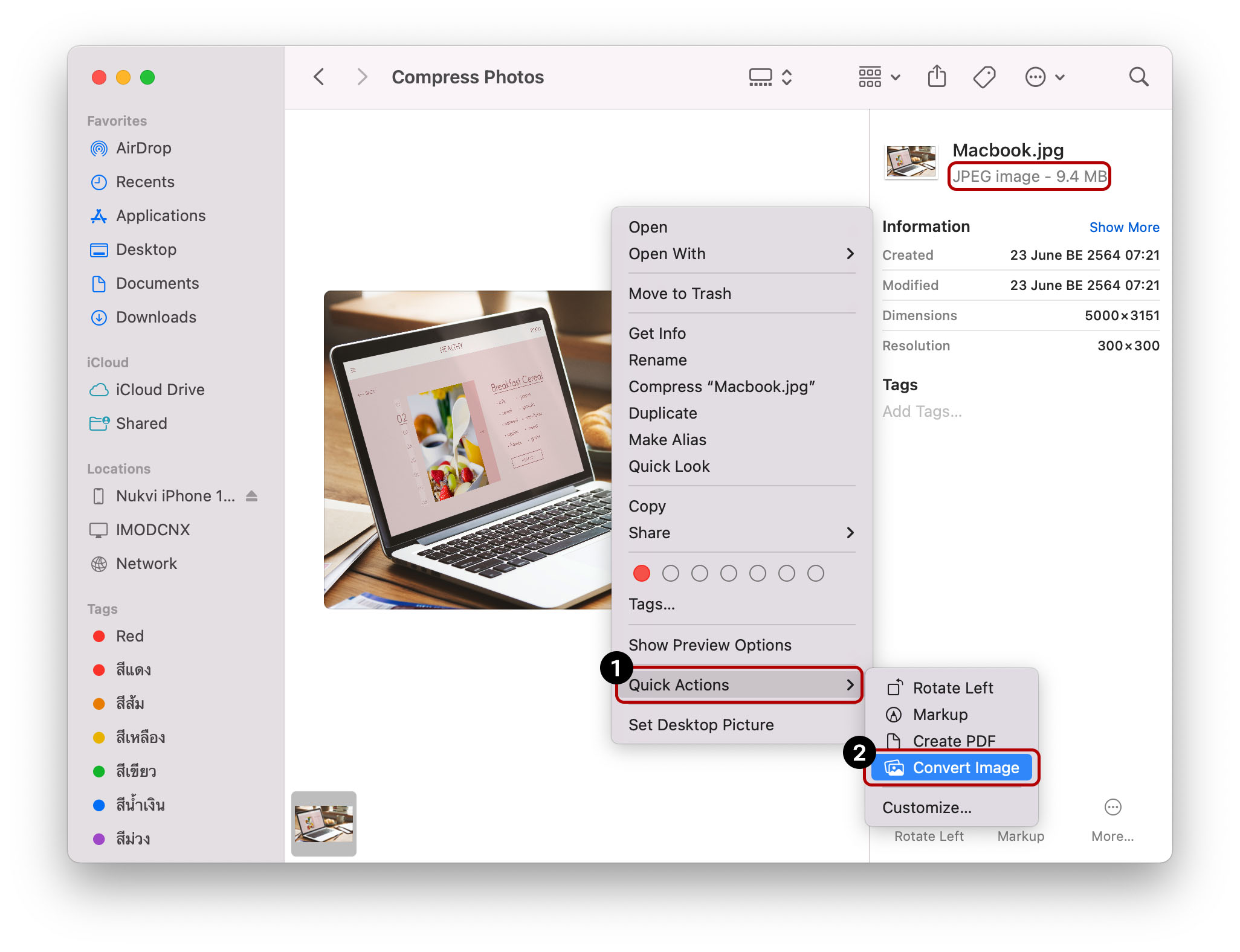 ผู้ใช้ macOS Monterey สามารถใช้ฟีเจอร์ Quick Actions ในการย่อขนาดภาพได้ โดยภาพที่แสดงในตัวอย่างมีขนาด 9.4 MB วิธีการย่อคือ