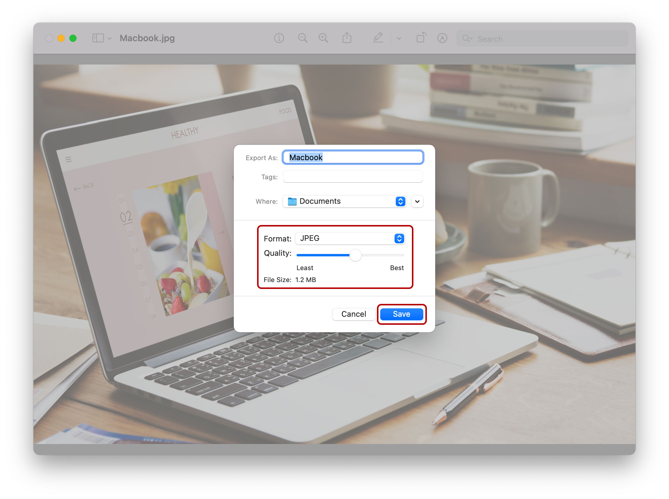 3. จากนั้นเลือกรูปแบบของรูปภาพตรง Format และปรับคุณภาพหรือ Quality ได้ตามต้องการ ยิ่ง Quality น้อย ขนาดภาพก็จะลดลงตามไป เมื่อได้ขนาดตามที่ต้องการแล้วกด Save