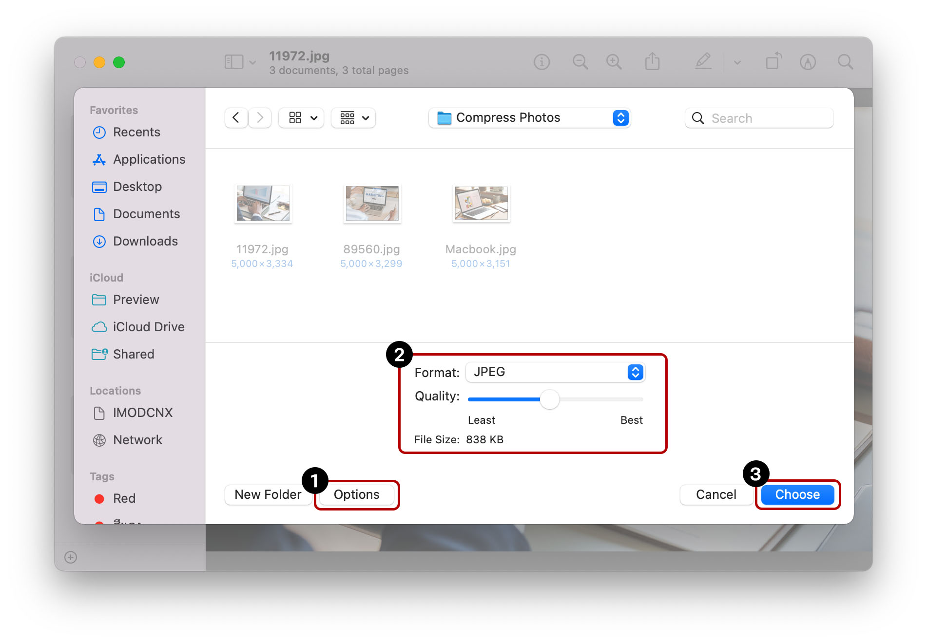 3. เลือก Options > ปรับ Format และ Quality ตามที่ต้องการ > Choose
