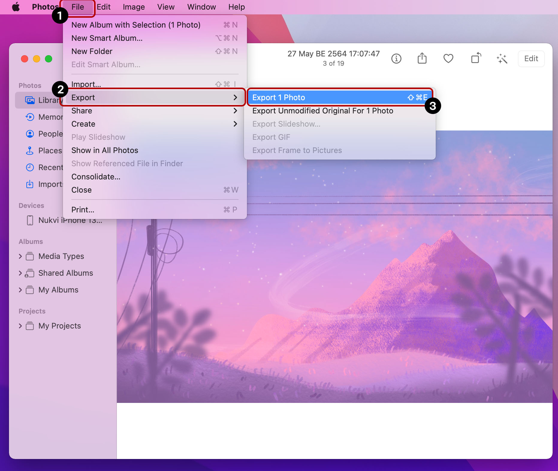 - จากนั้นเลือก File > Export > Export 1 Photo หรือ Command + Shift + E