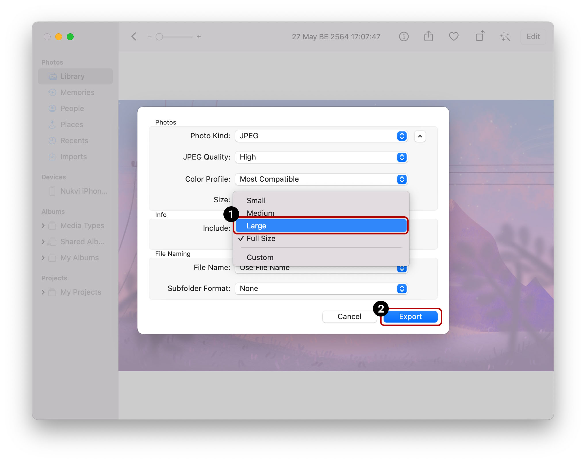3. จากนั้นปรับ Photo Kind, JPEG Quality และ Size ที่ทำให้ขนาดเล็กลง จากนั้นกด Export